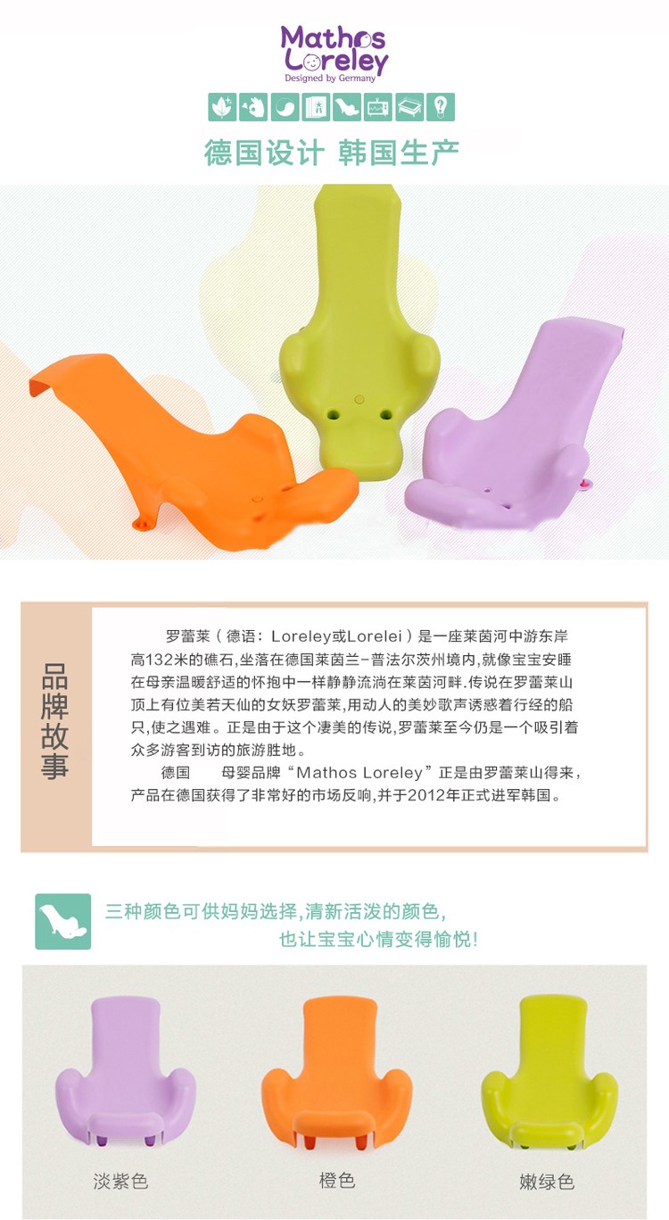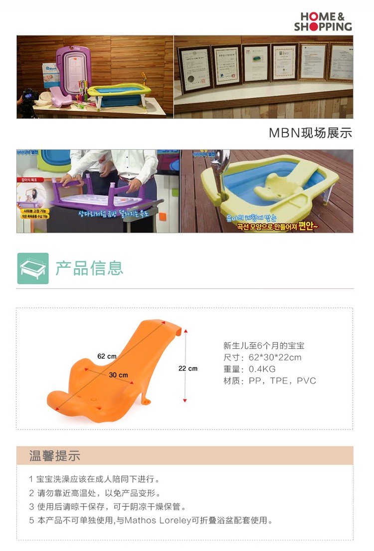 韩国原产Mathos Loreley新生儿浴盆靠背防滑可坐躺靠背 橙色 62*30*22cm