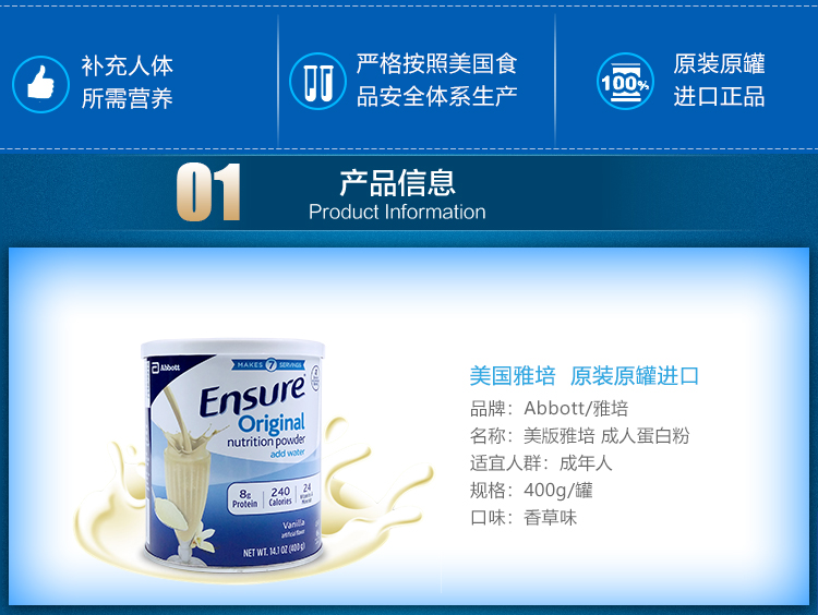 您所在的位置:首页 > 母婴用品  > 奶粉 > 孕妈奶粉  > 【美国直邮】美版Abbott 雅培Ensure大安素成人孕妈高营养奶粉 香草味 400g