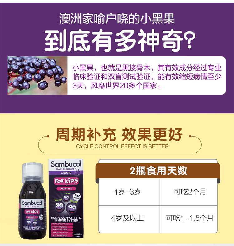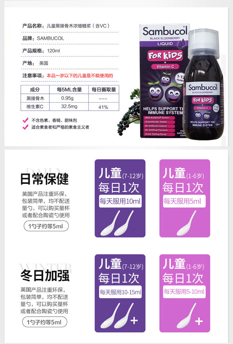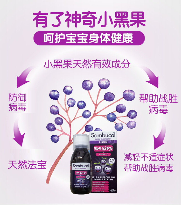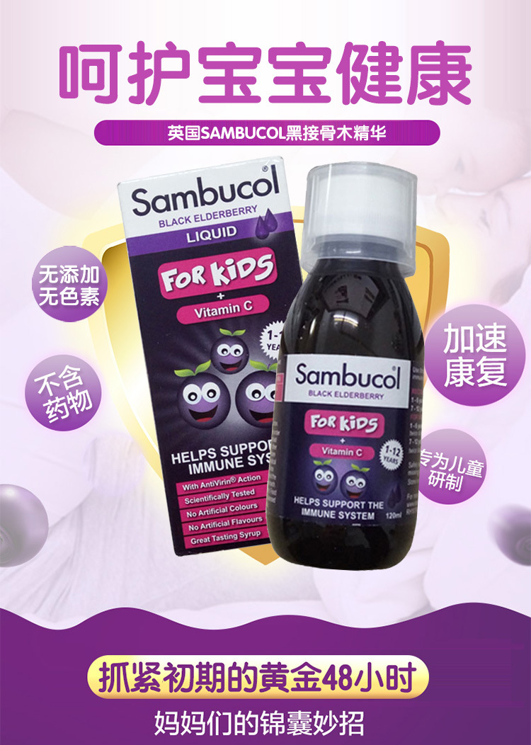 英国进口 sambucol儿童黑接骨木糖浆120ml增强体质防感冒 1-12岁