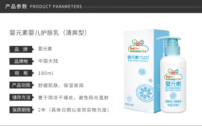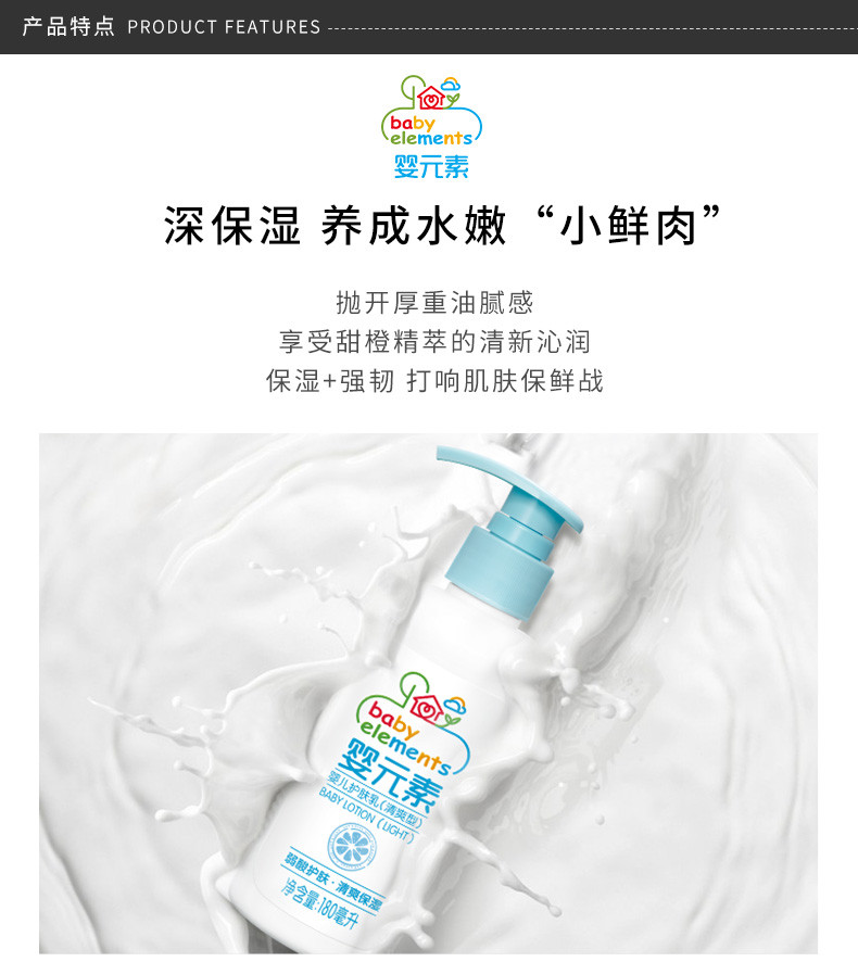 您所在的位置:首页 > 母婴用品  > 洗护用品 > 宝宝护肤  > 【清爽型】婴元素 婴儿护肤乳180ML