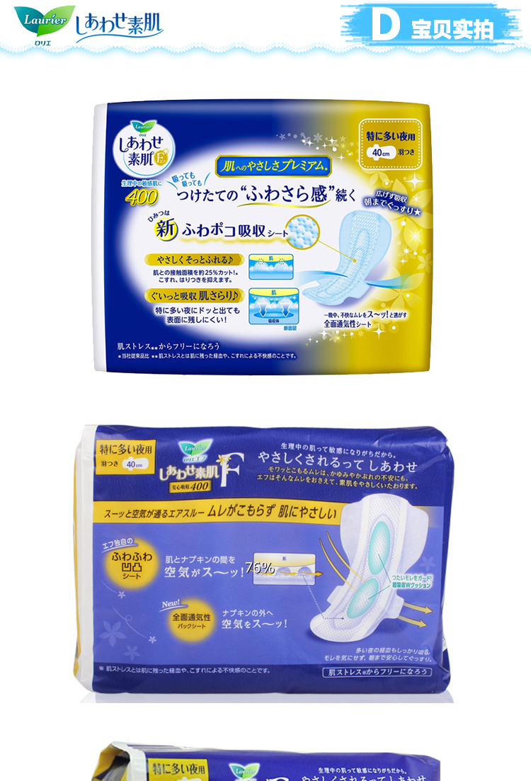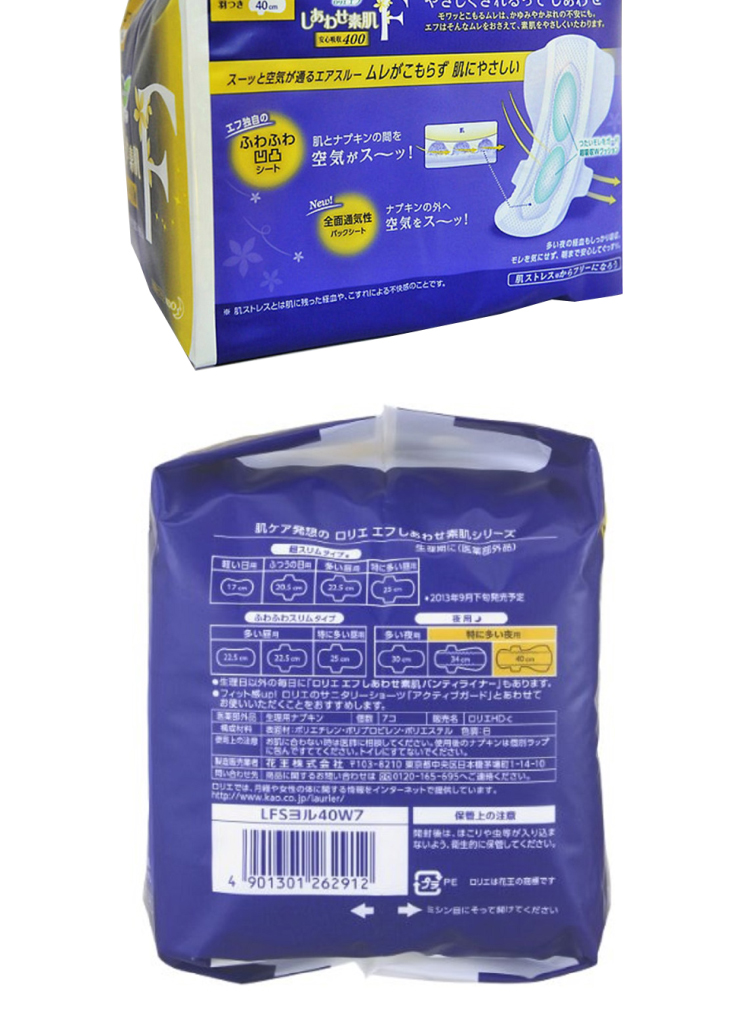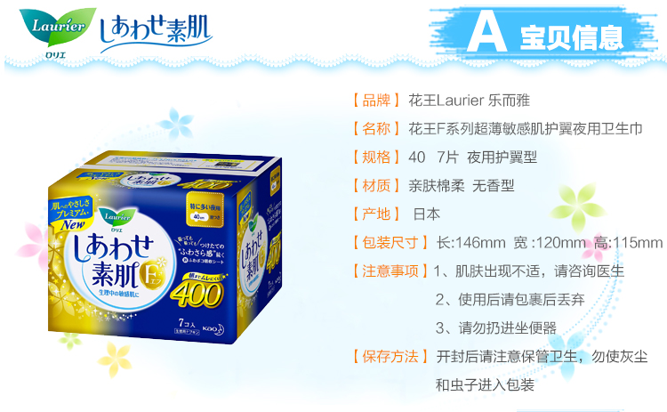 日本进口花王乐而雅棉柔瞬吸夜用加长护翼卫生巾40cm*7片