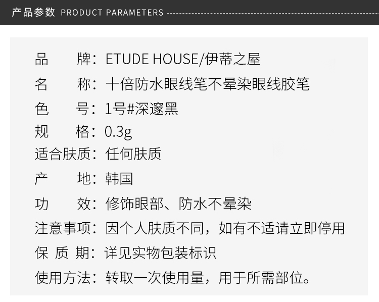 您所在的位置:首页 > 美妆护肤  > 香水彩妆 > 眼线笔/眼线液  > 【韩国直邮】ETUDE HOUSE伊蒂之屋 10倍十倍防水眼线笔不晕染眼线胶笔 1号#深邃黑 0.3g