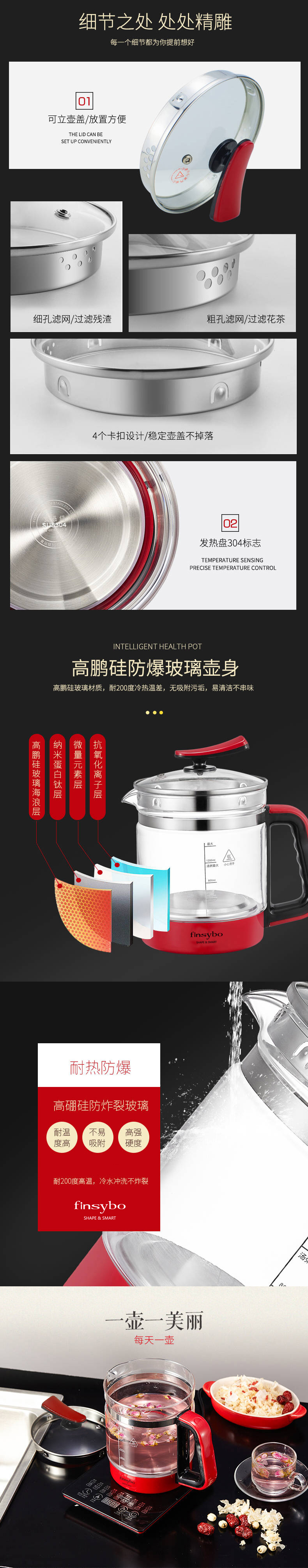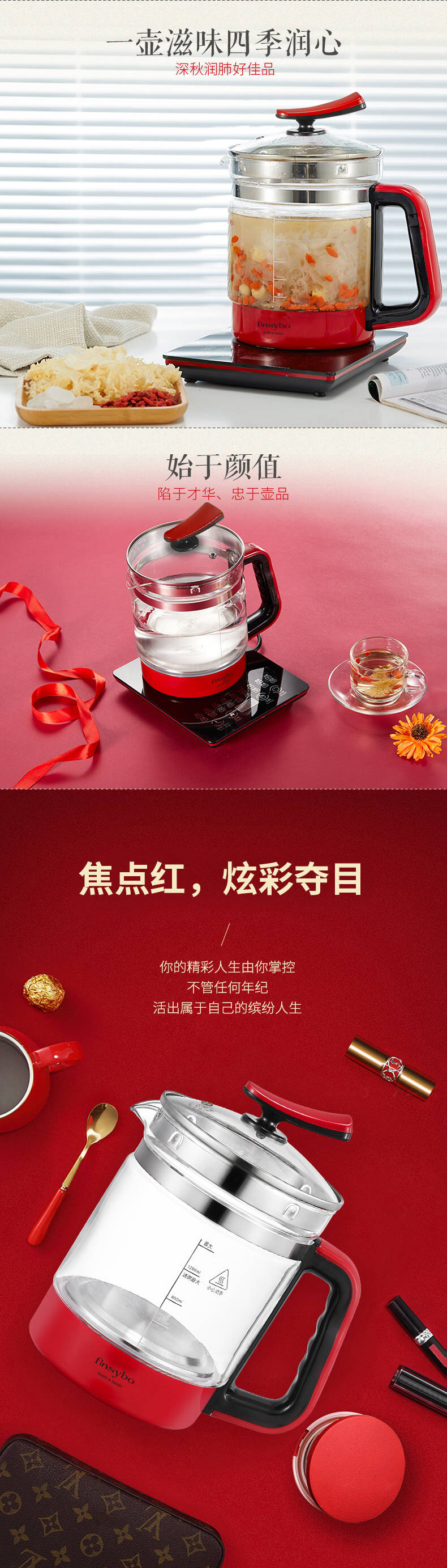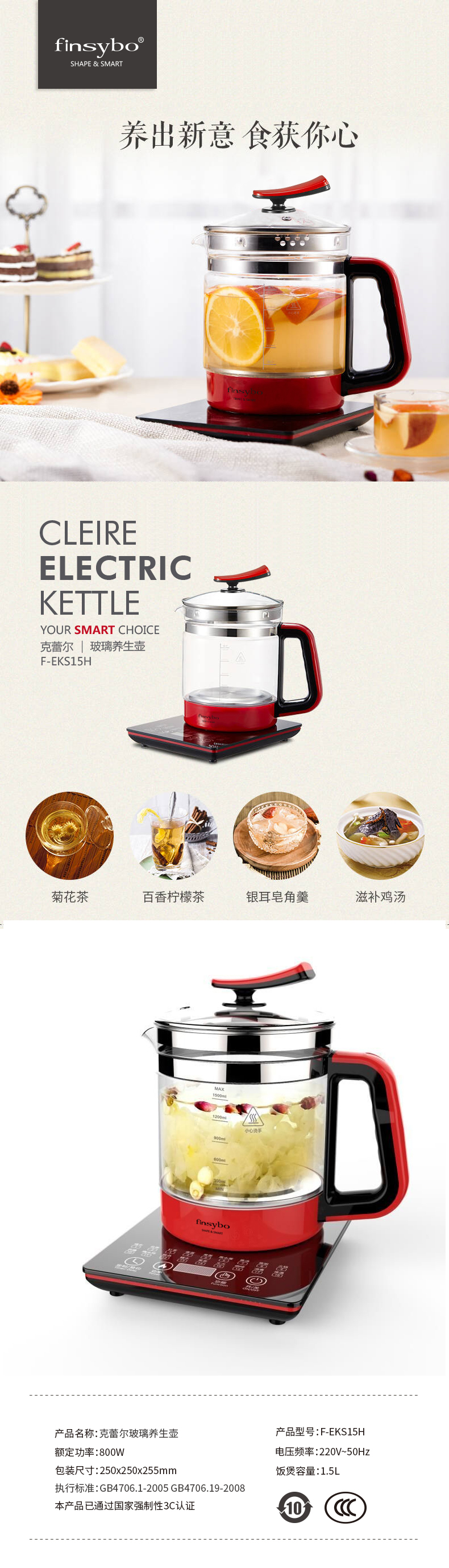 【授权商品】英国finsybo克蕾尔玻璃养生壶 F-EKS15H 1.5L 800W