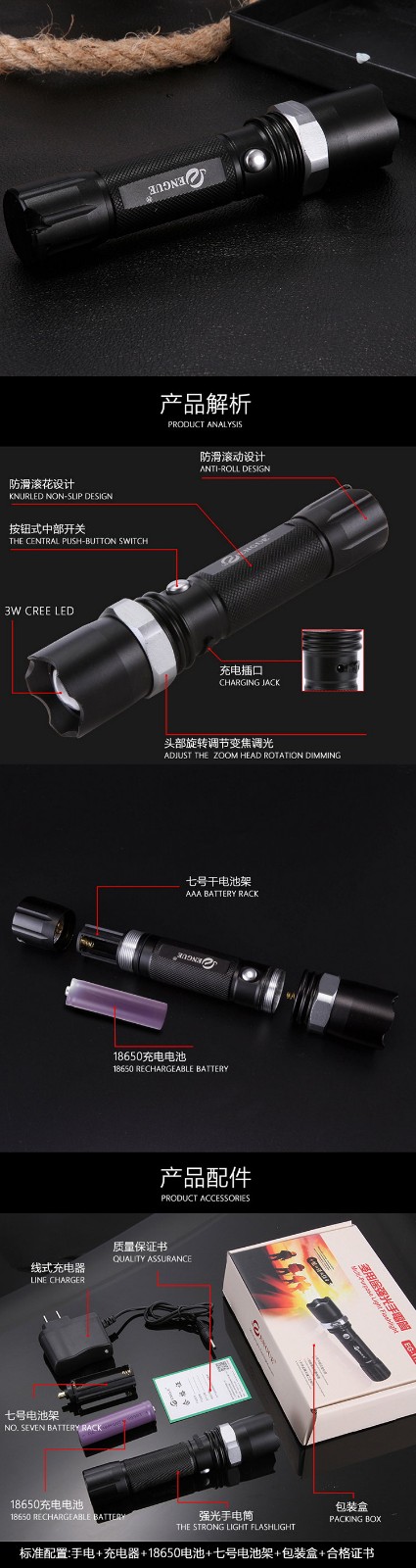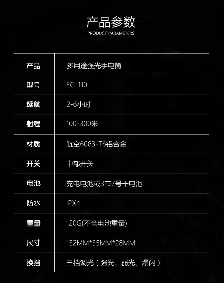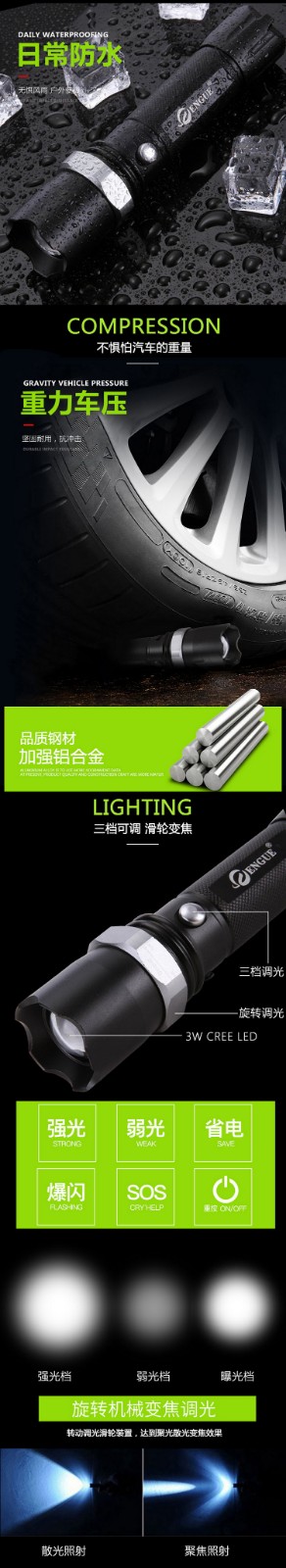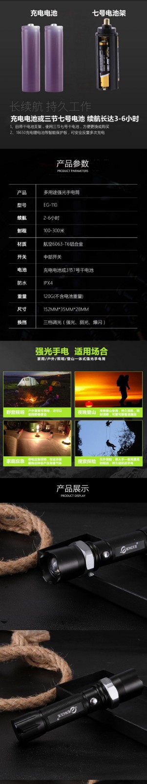 【授权商品】恩谷ENGUE 三档强光调焦金属手电筒 EG-110