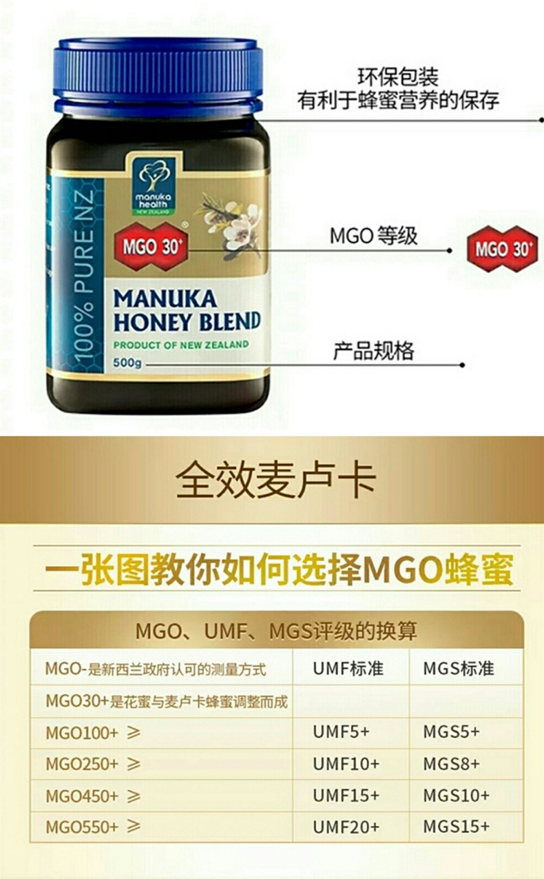 【香港直邮】新西兰Manuka Health 蜜纽康 麦卢卡活性蜂蜜MGO30+ 500g