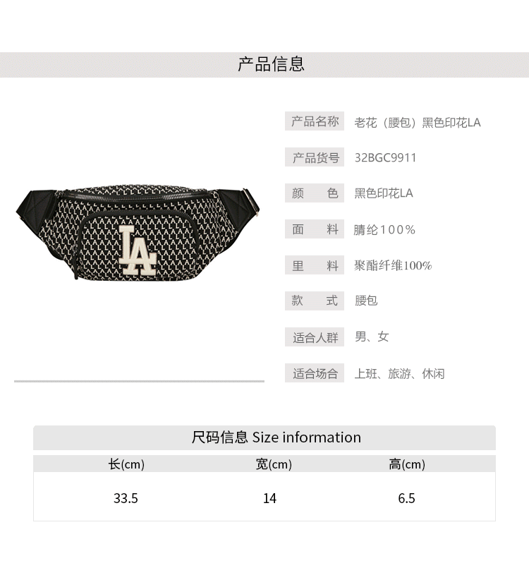 MLB美职棒棒球 老花(腰包)黑色印花LA32BGC9941-07L
