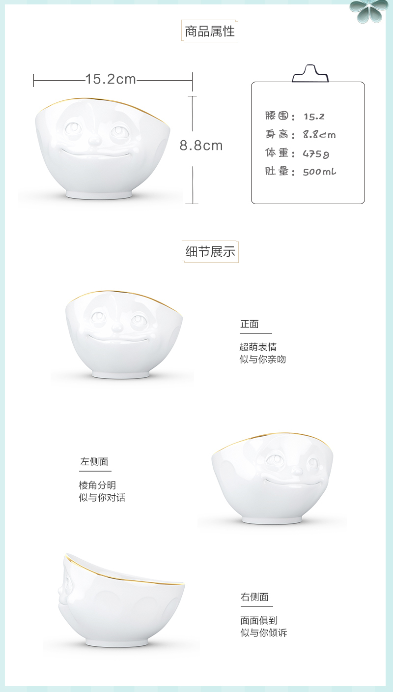 您所在的位置:首页 > 家居日用  > 餐具 >  > 【授权商品】德国原产Fiftyeight Tassen陶瓷卡通表情碗金边碗创意碗500ml幸福