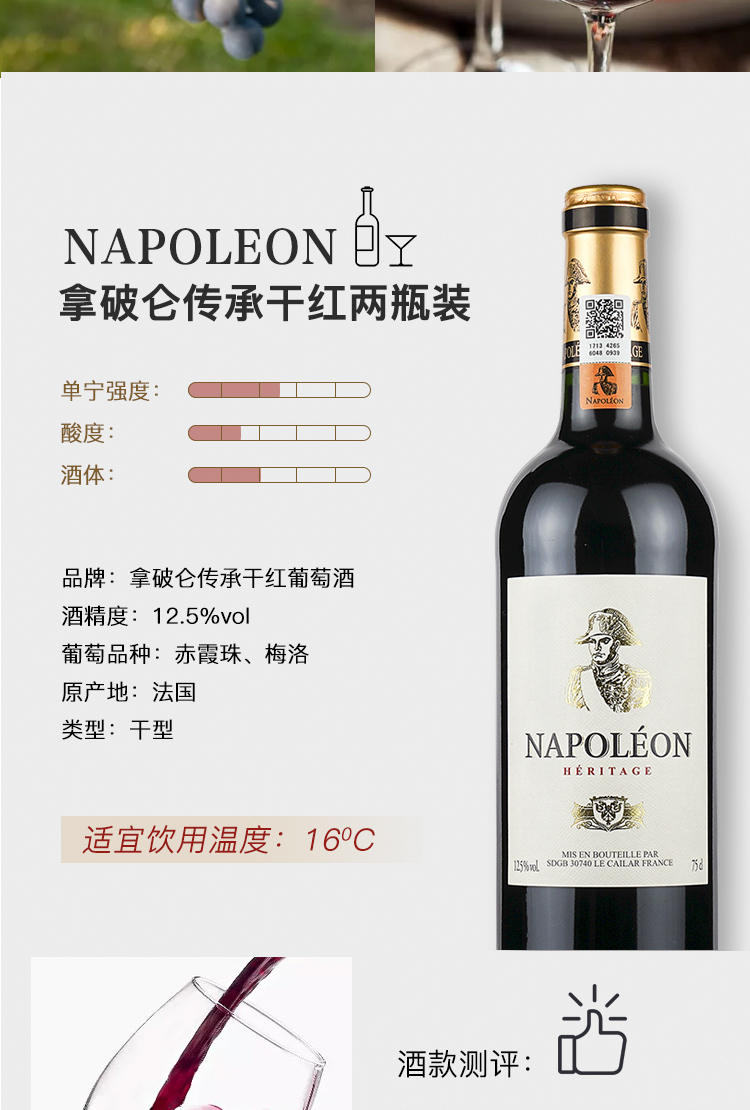 您所在的位置:首页 > 休闲食品  > 葡萄酒 > 葡萄酒  > 法国进口拿破仑传承干红750ml*2 礼盒装