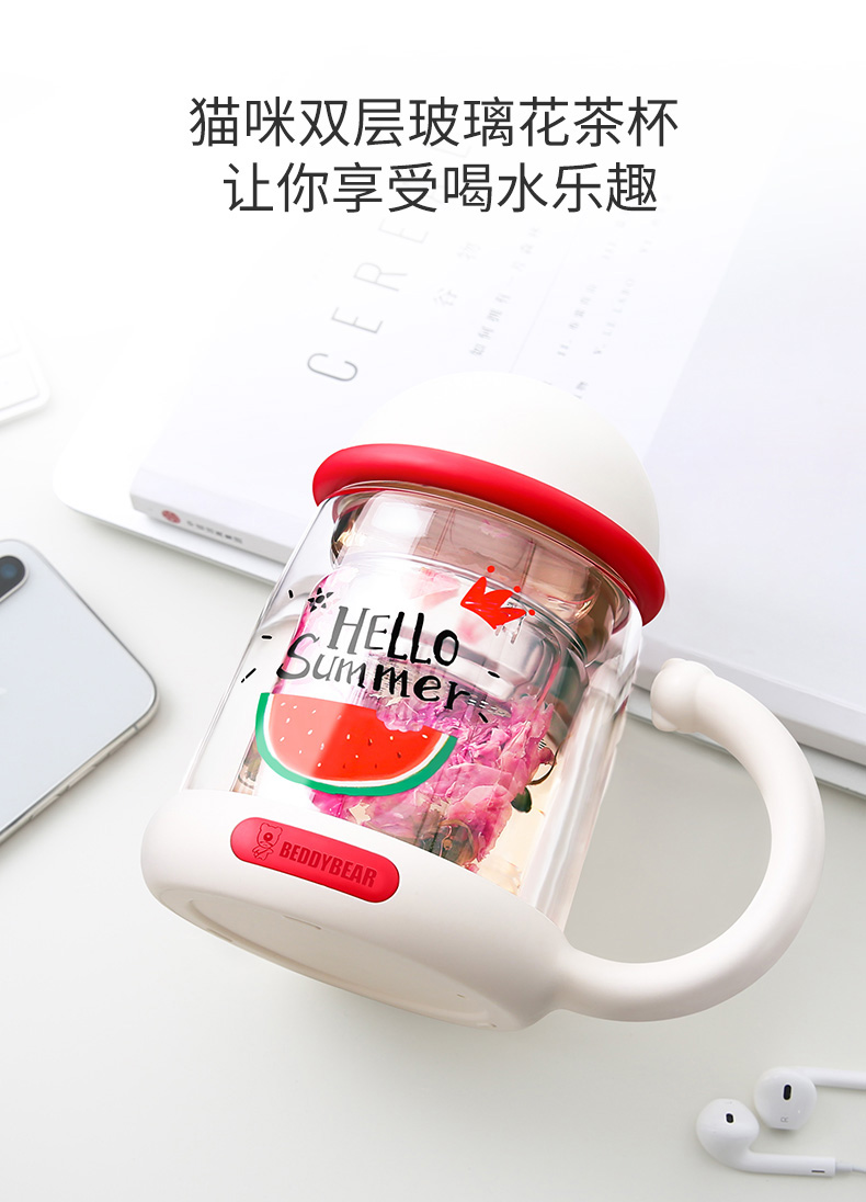 【授权商品】杯具熊双层耐高温玻璃杯可爱猫咪杯320ml 火烈鸟