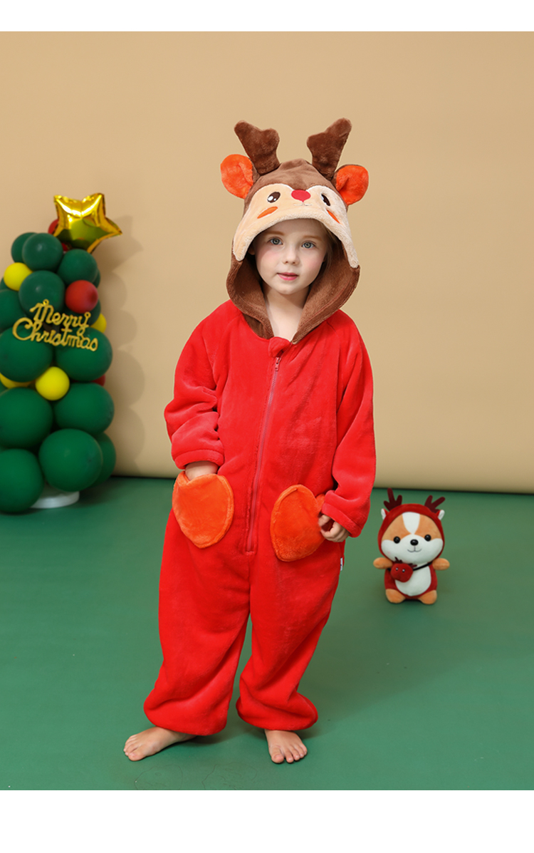 hugmii哈格美秋冬连体法兰绒亲肤保暖儿童家居服 红色麋鹿L码