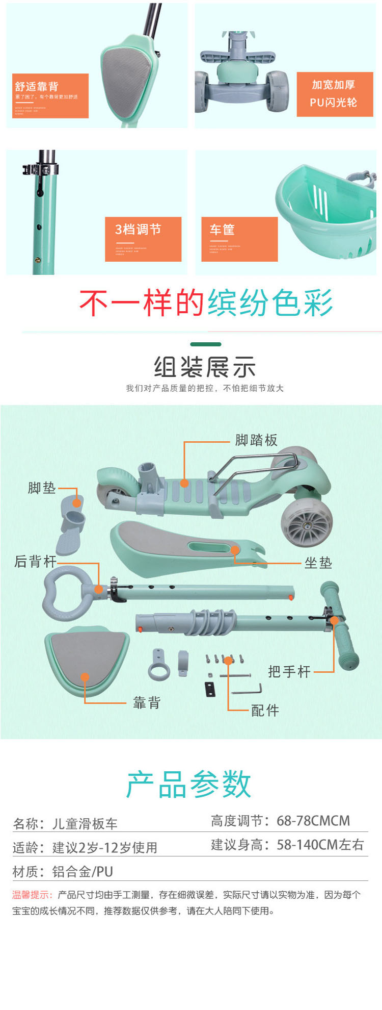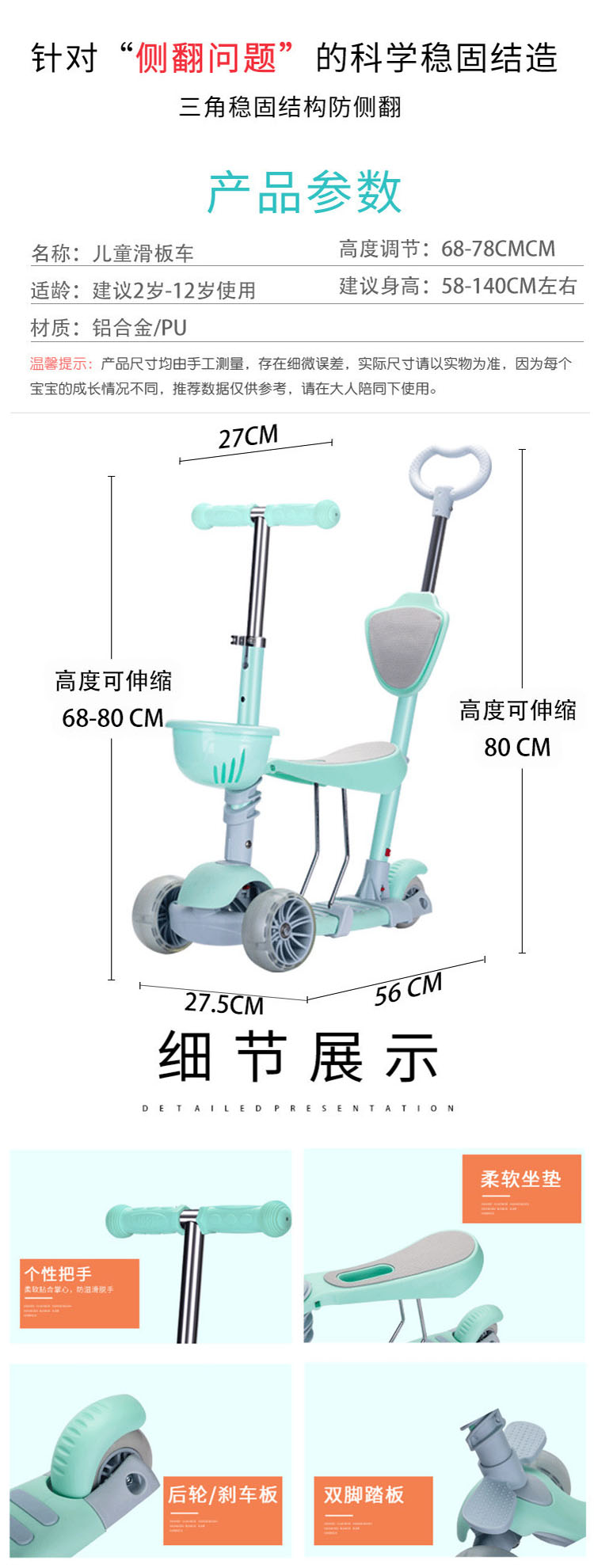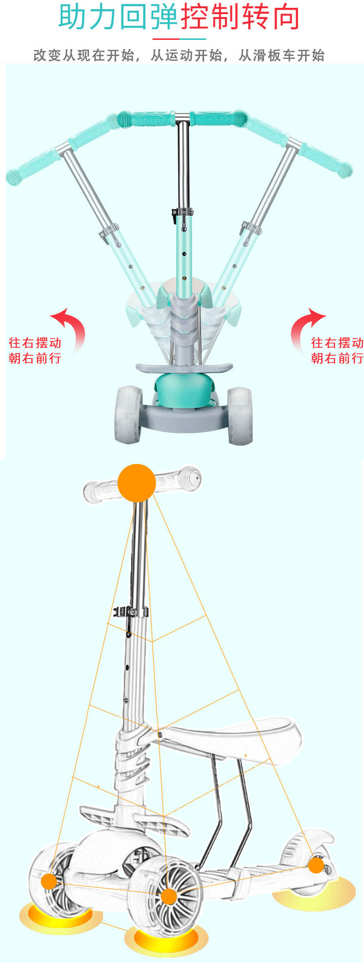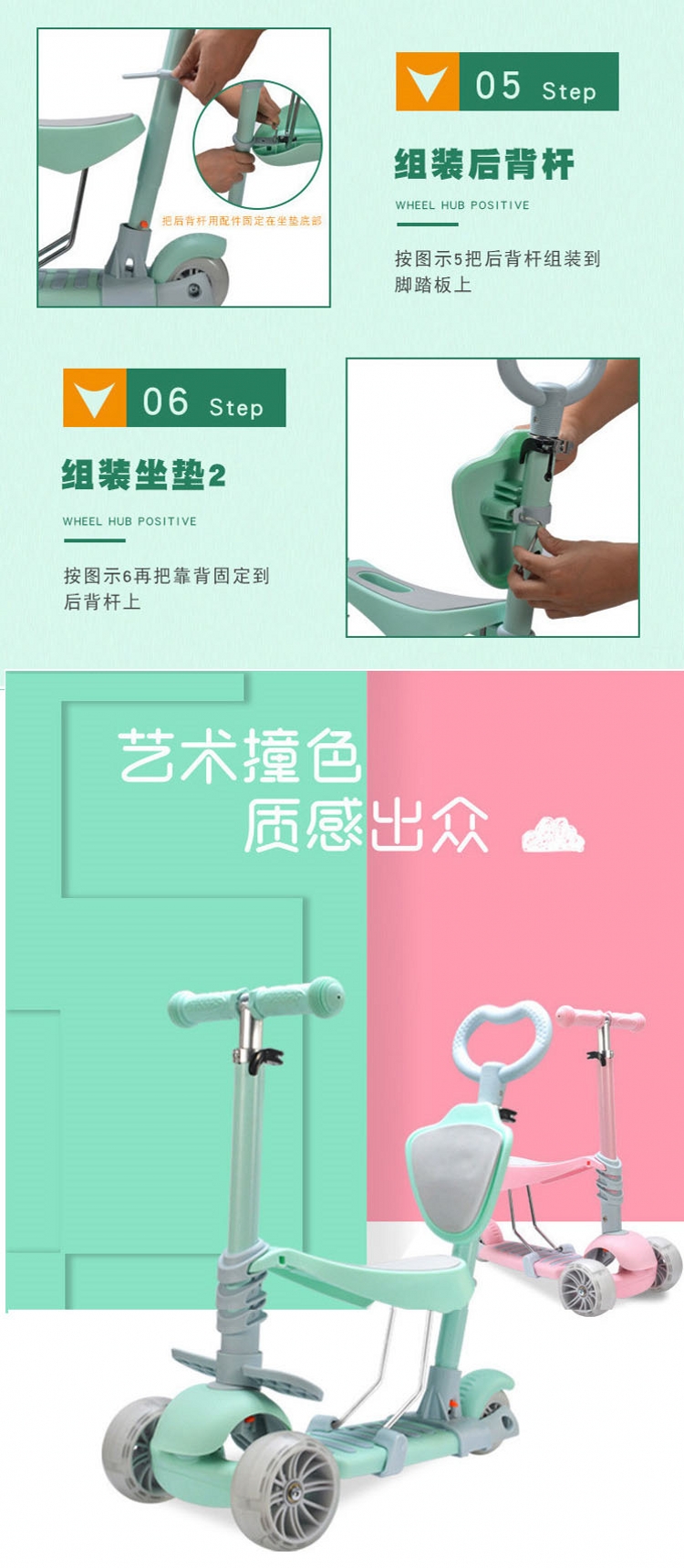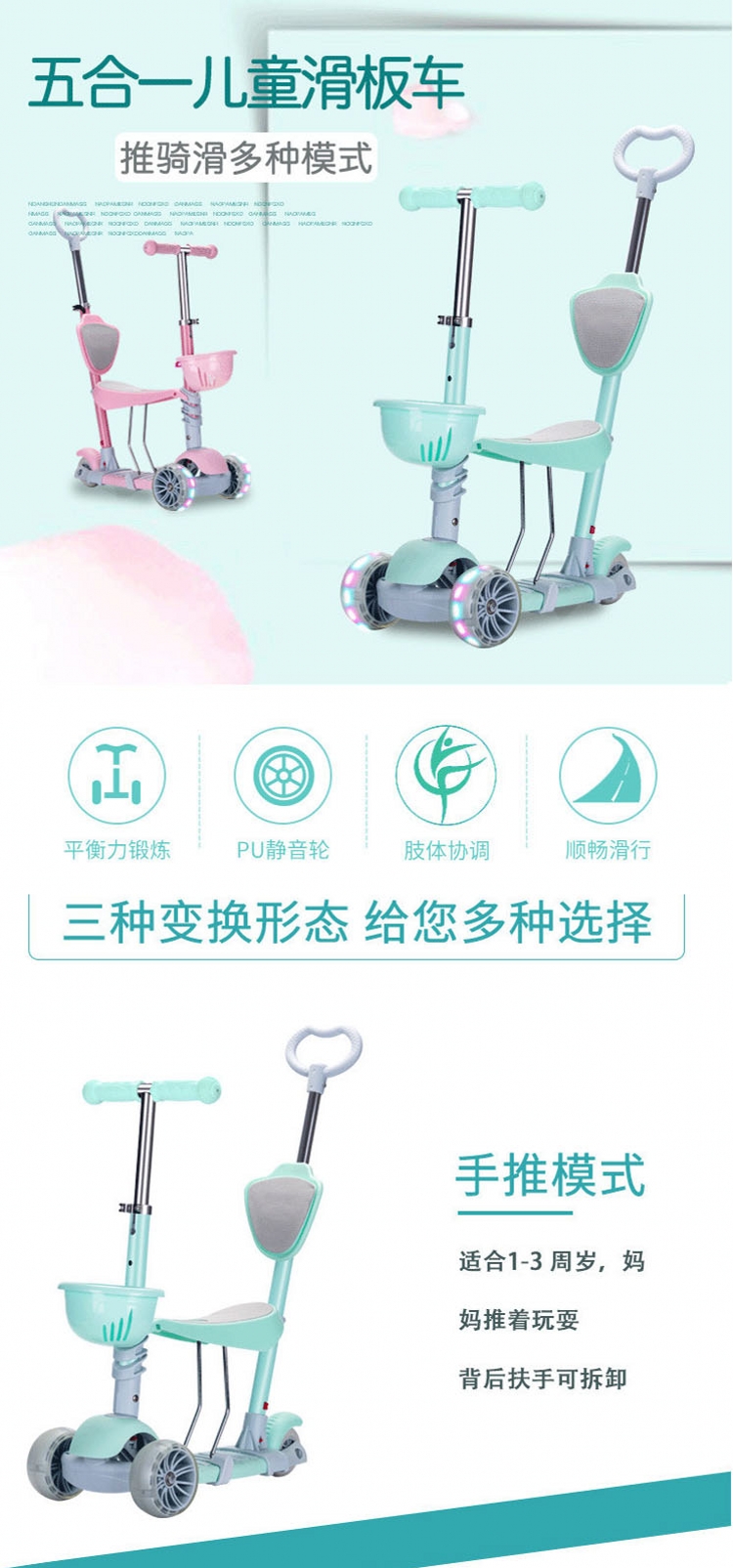 飞陆新款五合一带闪光儿童滑板车三轮手推折叠婴儿车学步童车