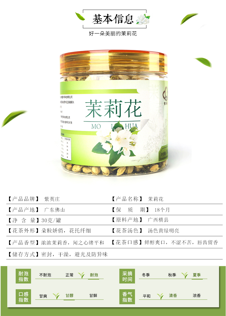 紫英庄 茉莉花 新鲜茉莉花罐装 茉莉花茶 30g 茶香浓郁爽口