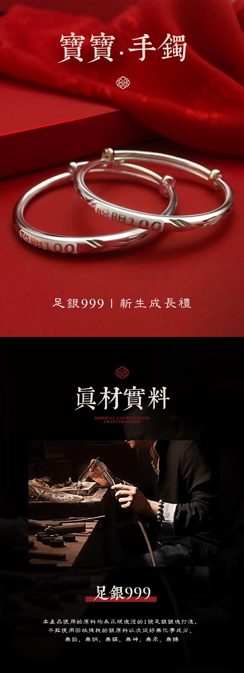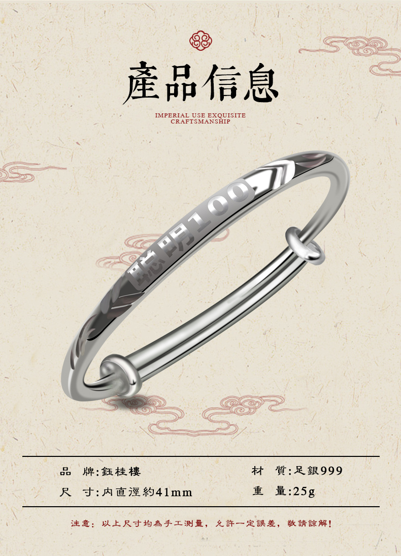 您所在的位置:首页 > 母婴用品  > 儿童装饰 > 珠宝首饰  > 钰桂楼 聪明100宝宝银手镯婴儿款999足银儿童镯子推拉式白银饰品送儿女满月生日礼物