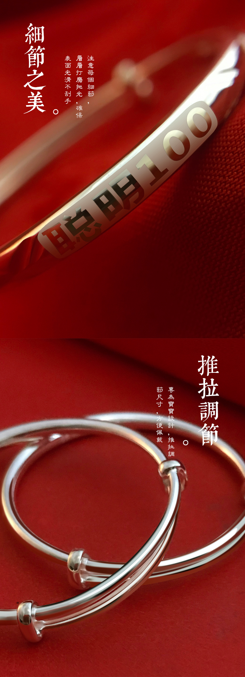钰桂楼 聪明100宝宝银手镯婴儿款999足银儿童镯子推拉式白银饰品送儿女满月生日礼物