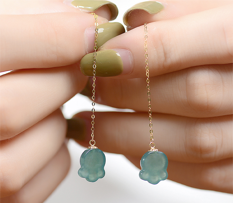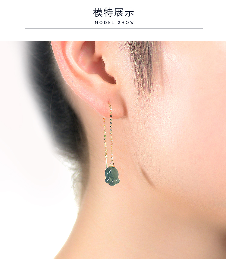 翠雅金楼18K镶天然冰种蓝水飘雪花棉熊掌翡翠耳饰玉耳饰K金耳饰