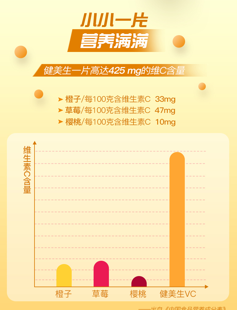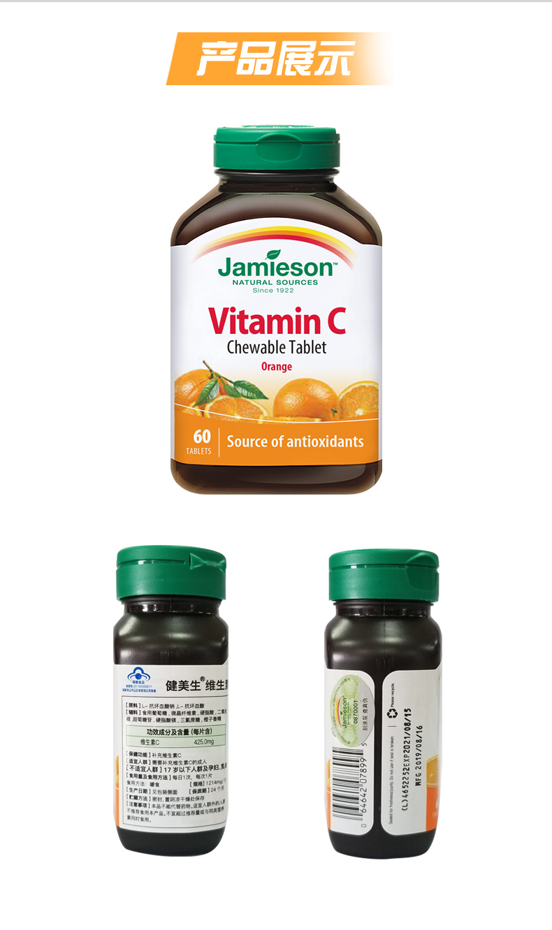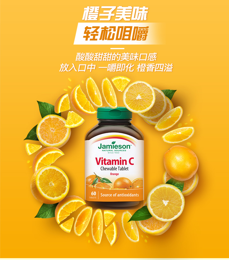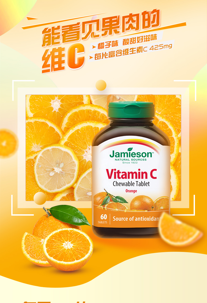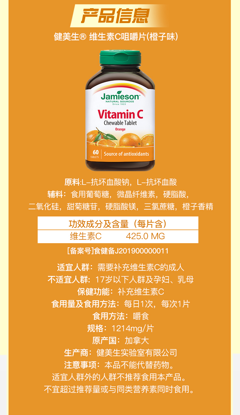 健美生高含量维生素C咀嚼片甜橙味425mg*60片加拿大进口果肉VC片