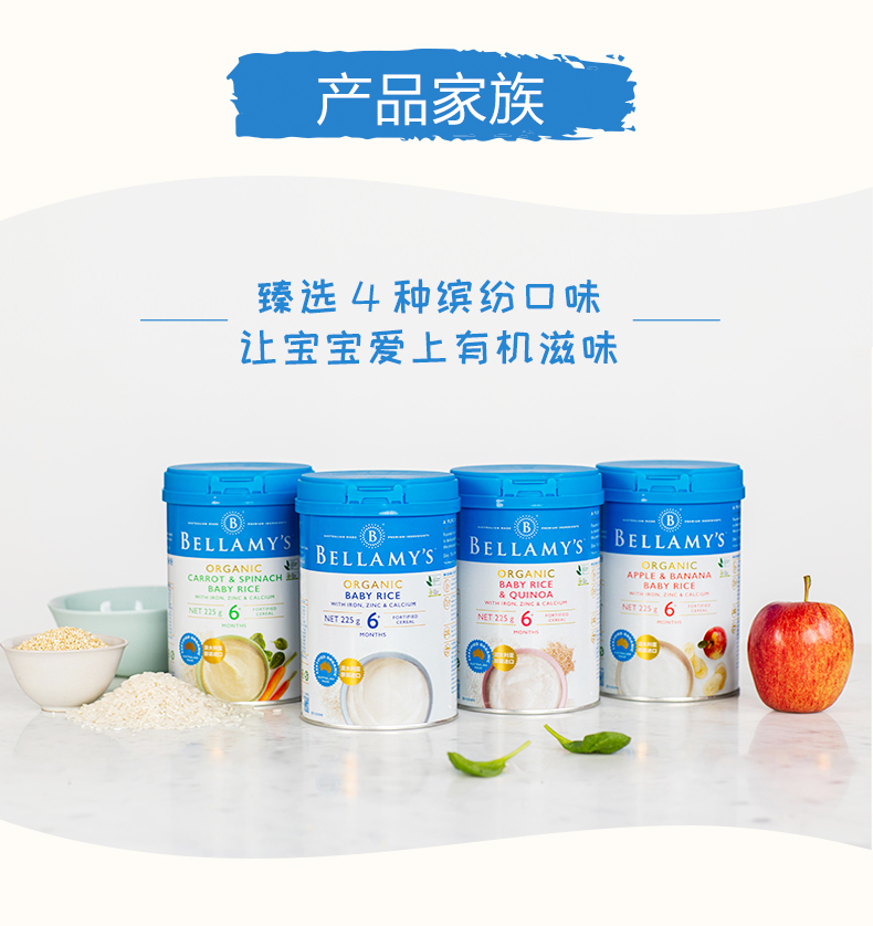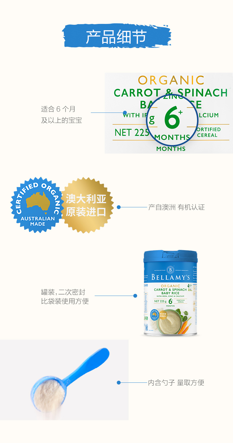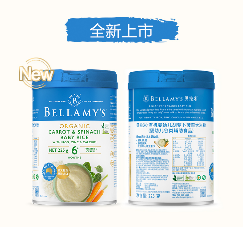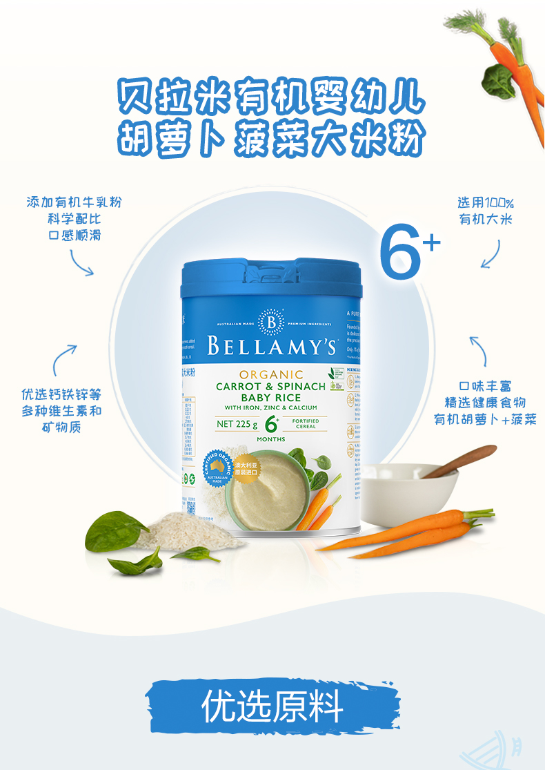 澳洲进口贝拉米有机高铁婴幼儿胡萝卜菠菜大米粉225g