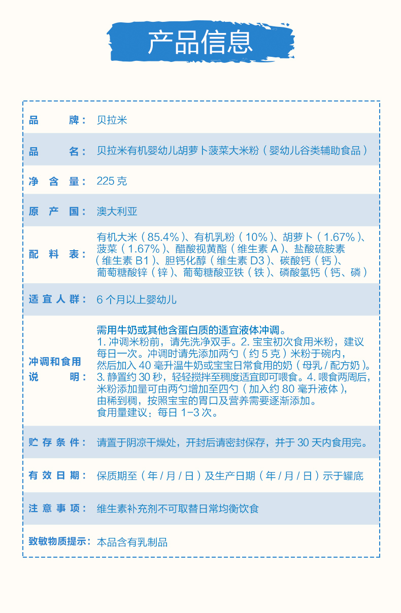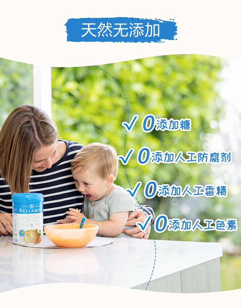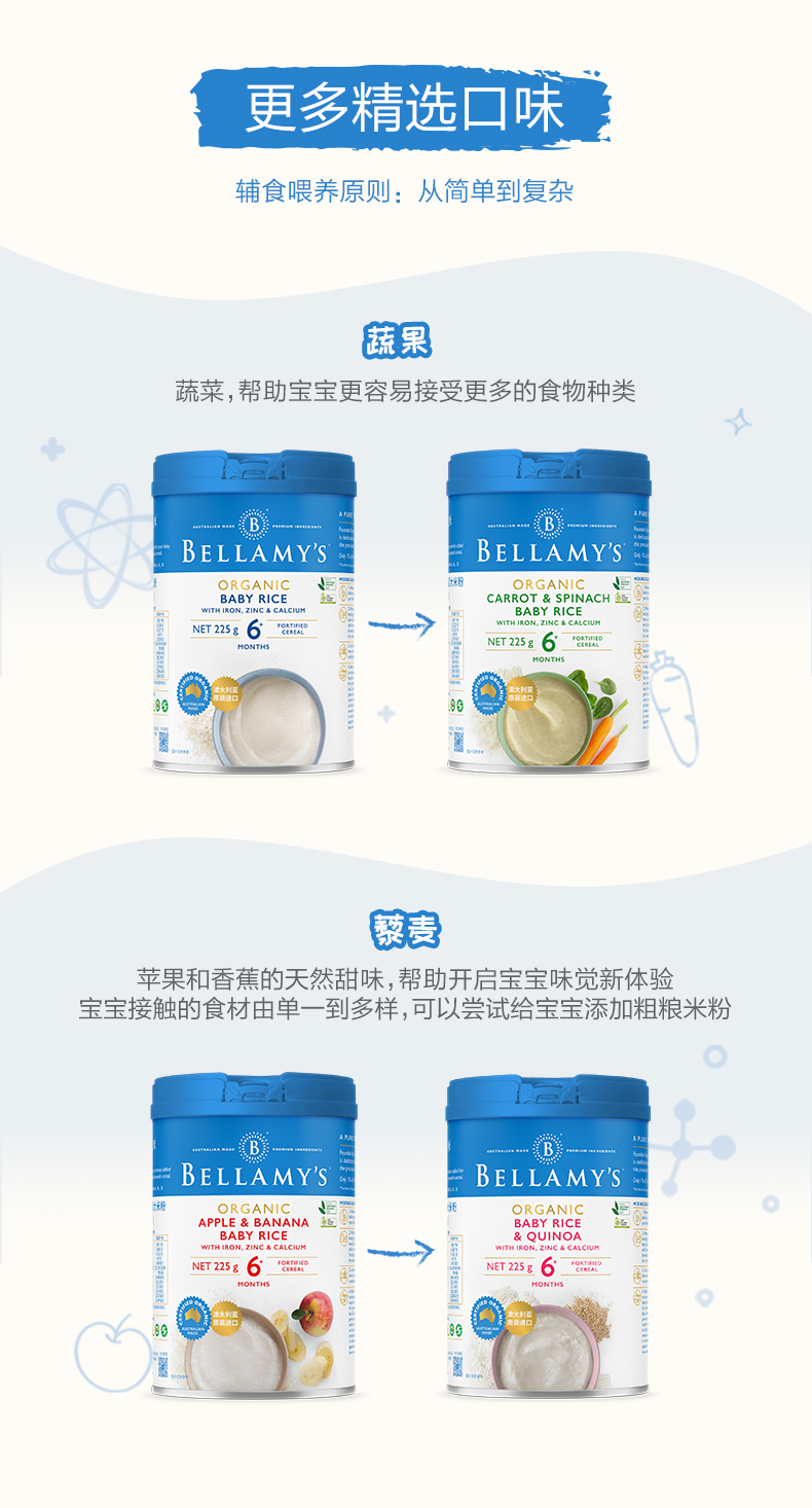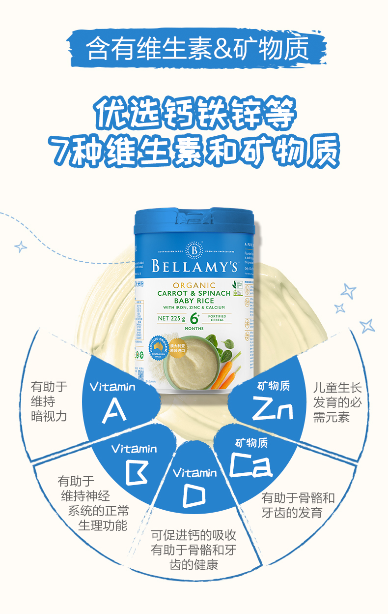 澳洲进口贝拉米有机高铁婴幼儿胡萝卜菠菜大米粉225g