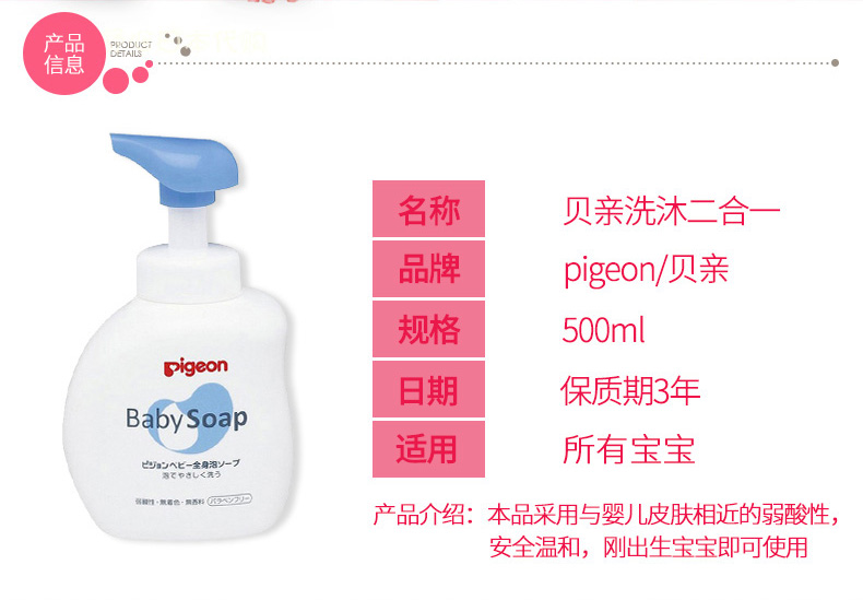 您所在的位置:首页 > 母婴用品  > 洗护用品 > 洗发沐浴  > 日本贝亲Pigeon沐浴露 洗发二合一无香清爽型 500ml(蓝色)