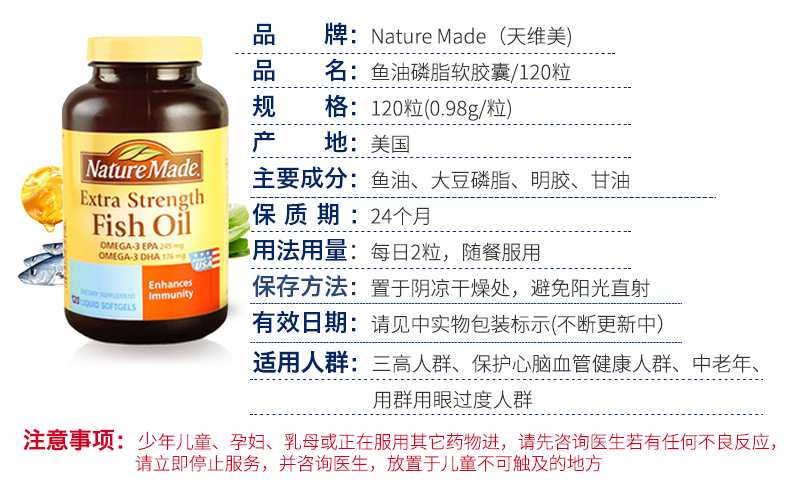 美国Nature Made 天维美牌鱼油磷脂软胶囊 120粒