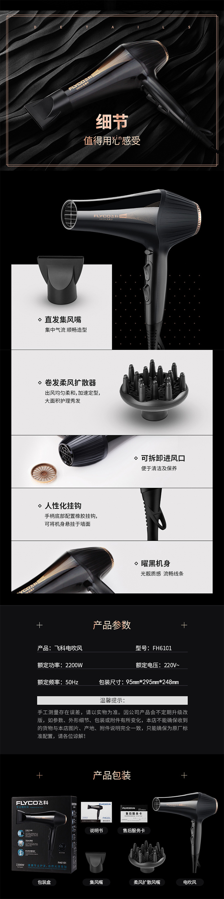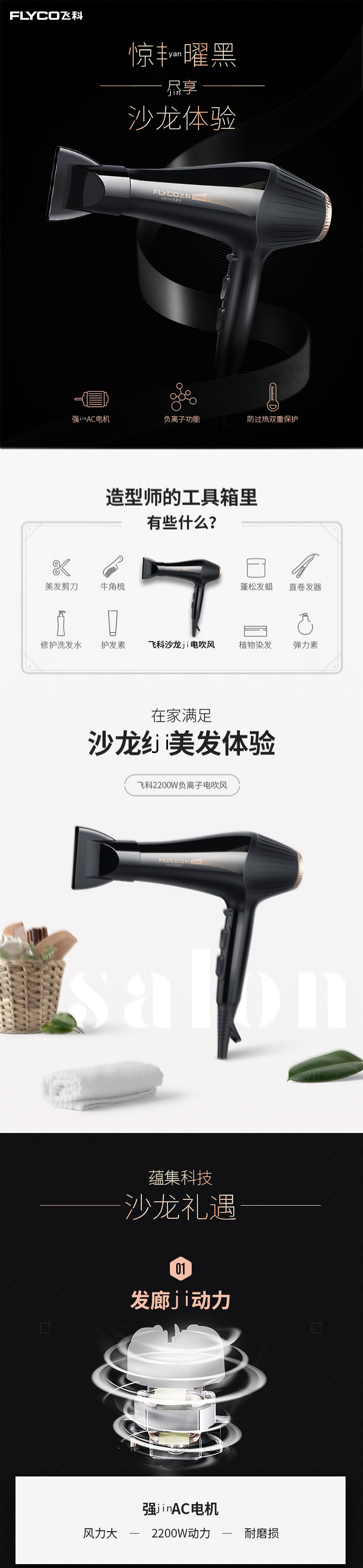 飞科(FLYCO)2200W家用发廊大功率吹风机负离子冷热风吹风筒理发店酒店宾馆电吹风机FH6101