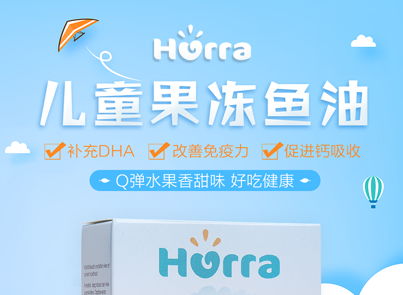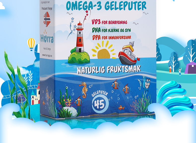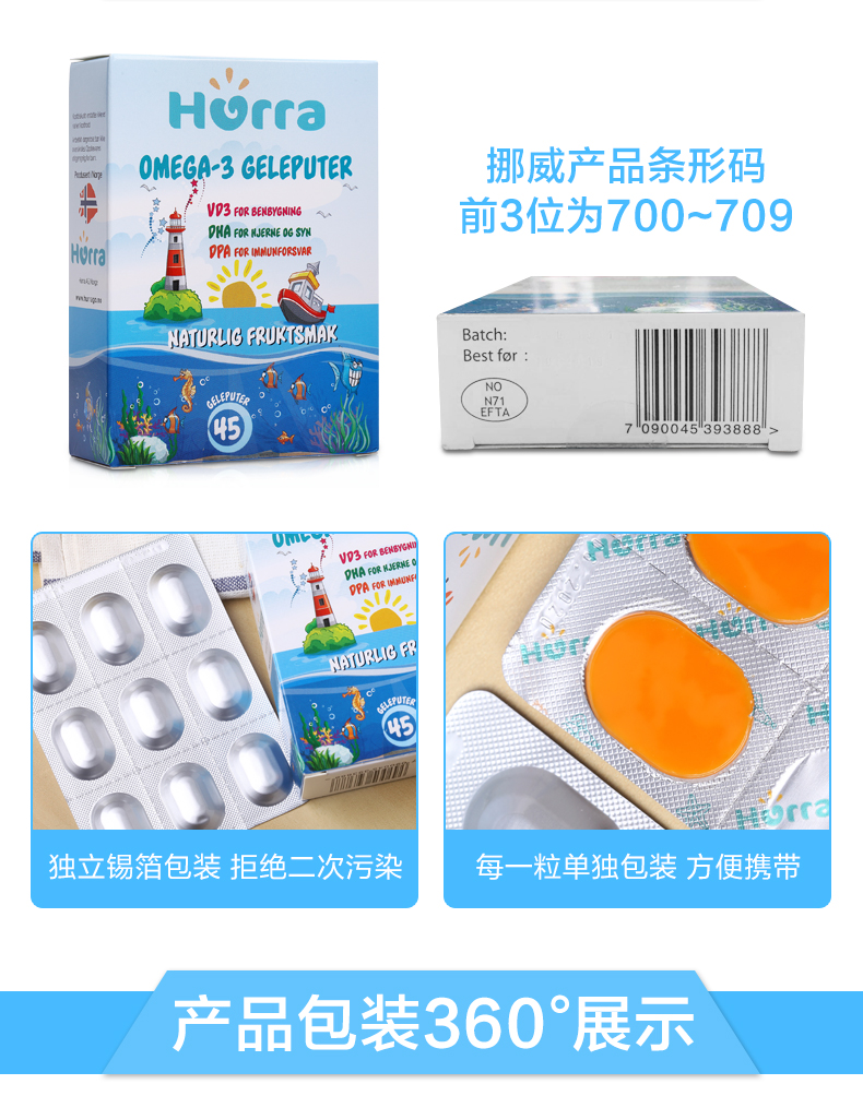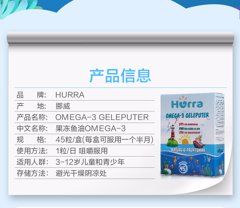 挪威Hurra儿童深海鱼油OMEGA-3果冻软糖 DHA补脑增强记忆力45粒