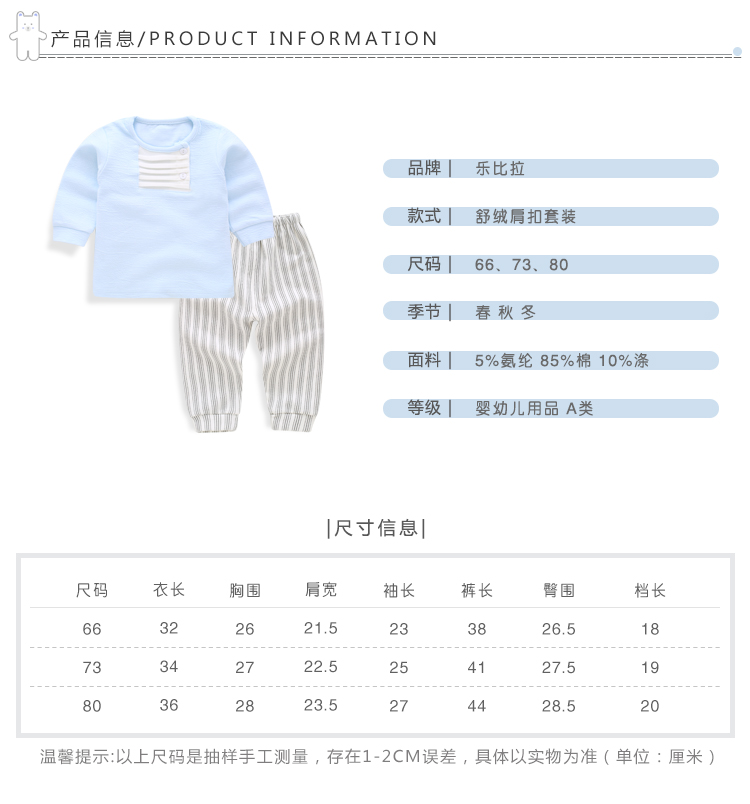 您所在的位置:首页 > 母婴用品  > 婴童服饰 > 童装  > 乐比拉婴儿内衣肩扣两件套宝宝套头打底衣85339-16起皱条纹66-73-80蓝