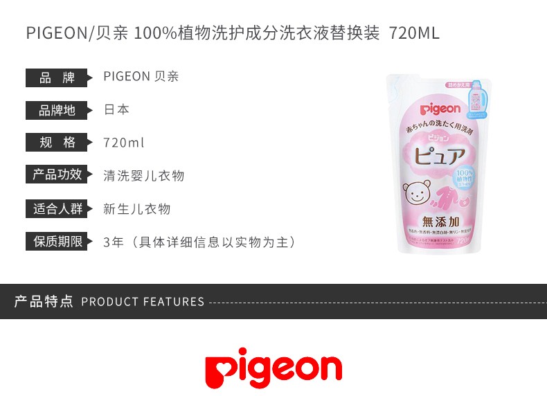 日本贝亲Pigeon洗衣液袋装720ml新版