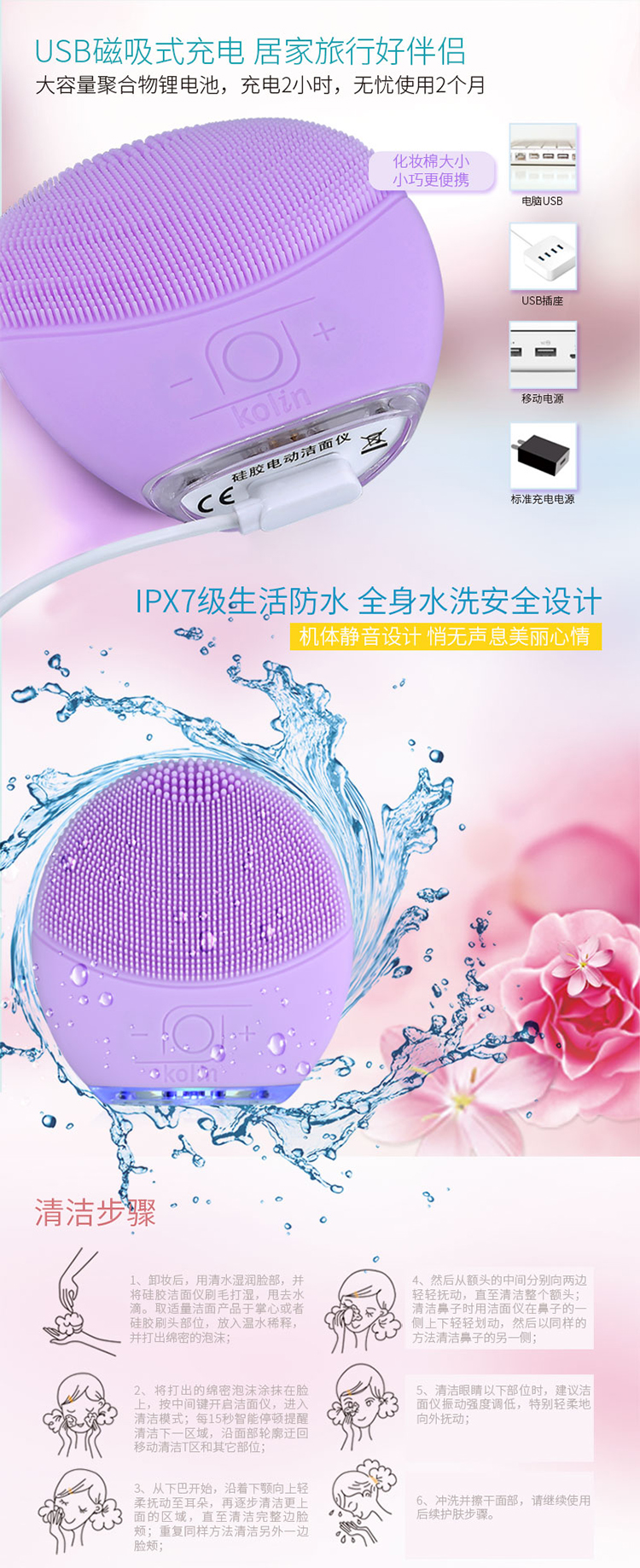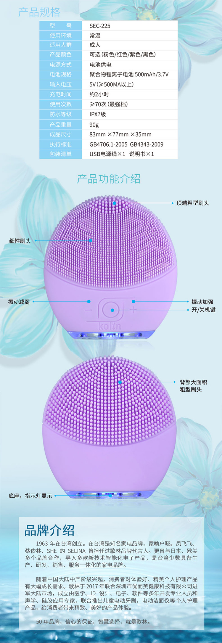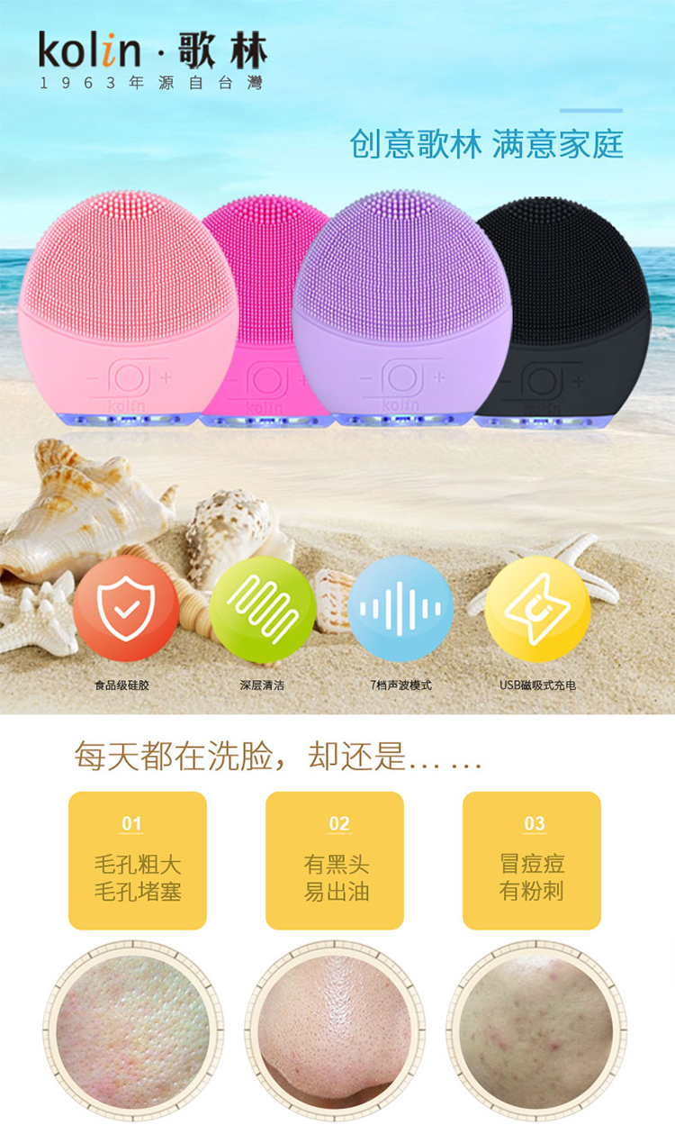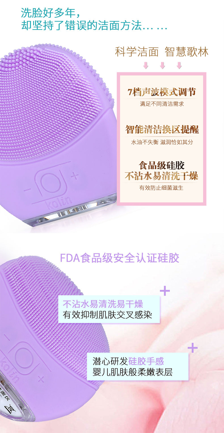 中国台湾kolin硅胶电动洁面仪SEC225黑色七档调节