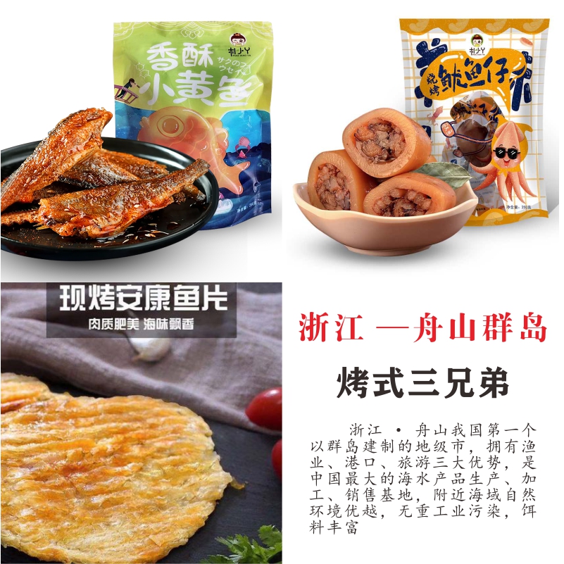 浙江.舟山网红爆款海味烤式三兄弟香酥小黄鱼(炭烤版)90g/包*1 +炭烤拉丝爆头鱿鱼仔 90g/包*1 +炭烤安康鱼片 40g/包*1