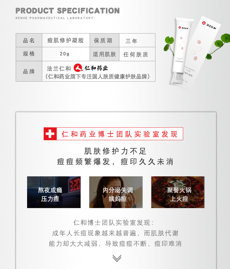 仁和痘肌修护凝胶淡化修复凹洞芦荟胶青春期男女非祛痘疤20g