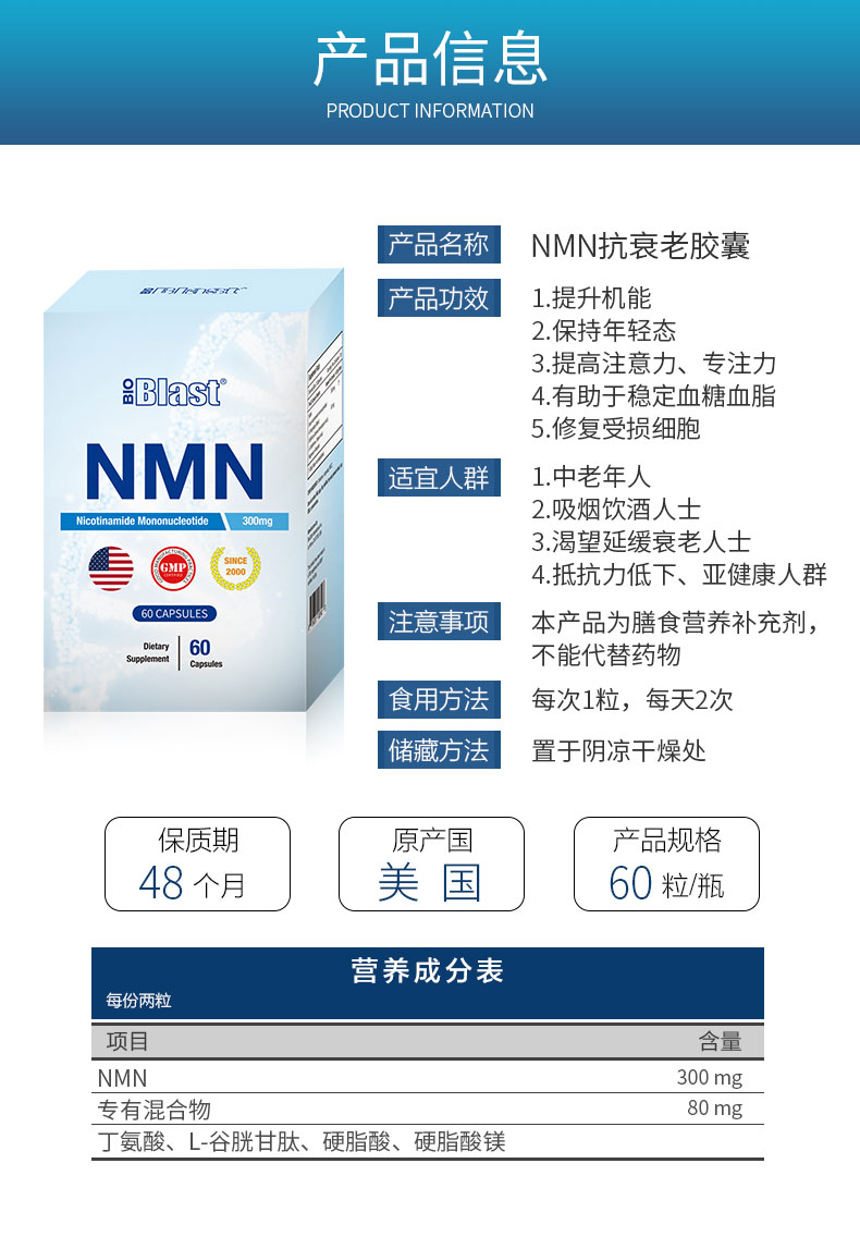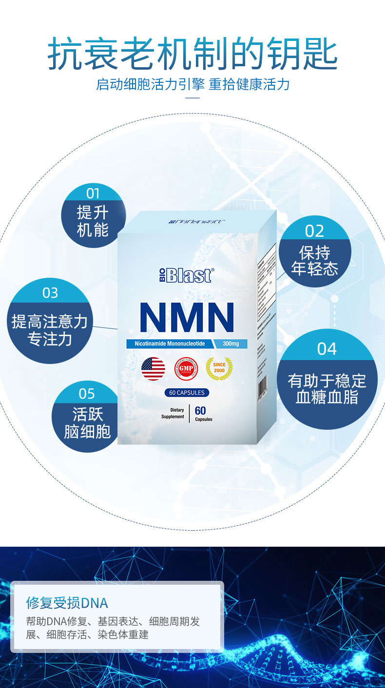 美国bioblast NMN抗衰老胶囊60粒
