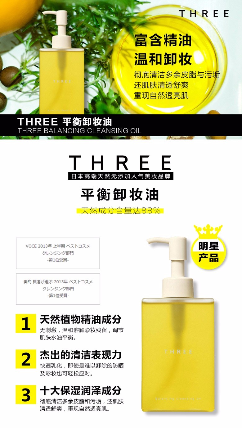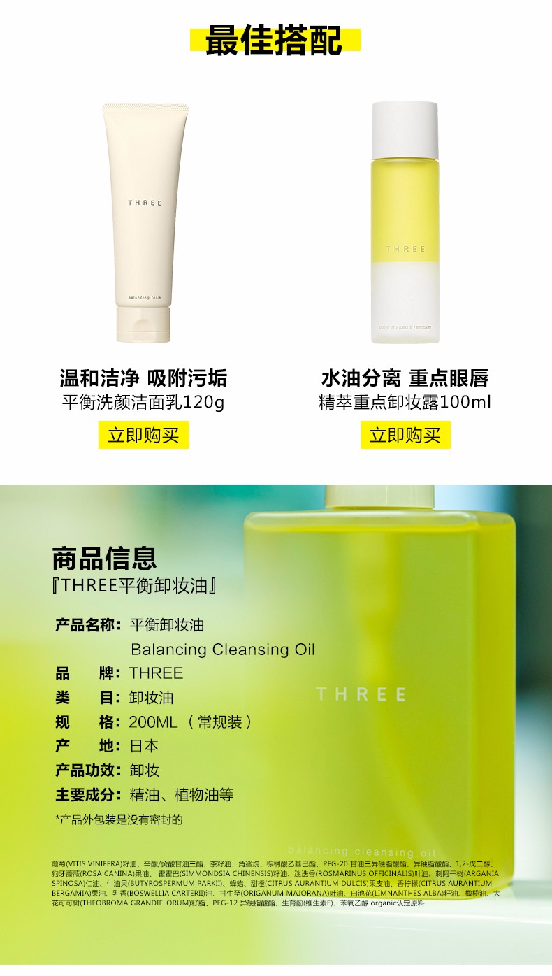 THREE 纯植物平衡洁肤卸妆油 200ML