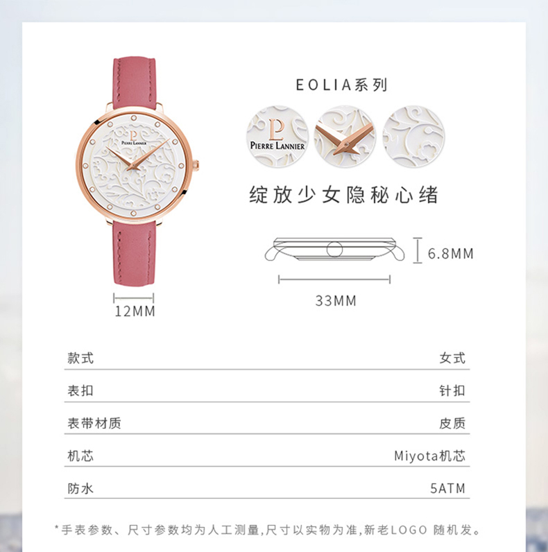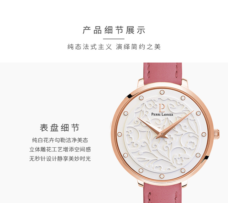 您所在的位置:首页 > 服饰箱包  > 饰品/手表 > 石英表  > 连尼亚(PIERRE LANNIER)法国女士手表 EOLIA浮雕系列 33mm莫奈花园时尚3D立体雕花小众石英女表PL-041K605