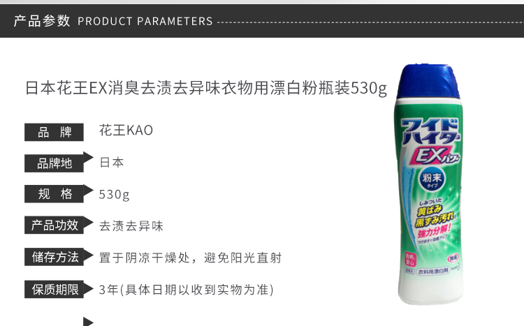 您所在的位置:首页 > 家庭清洁  > 衣物清洁 > 其它衣物清洁  > 日本花王EX消臭去渍去异味衣物用漂白粉瓶装530g