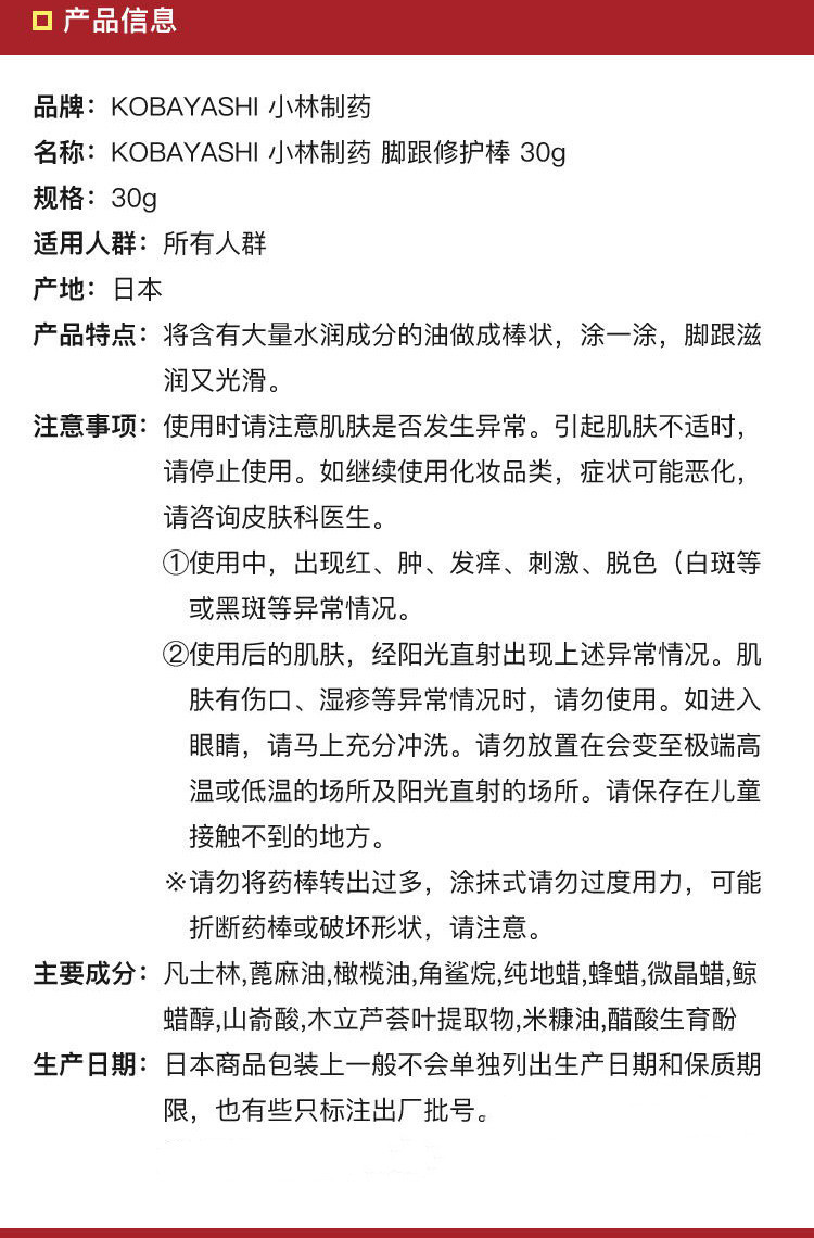 您所在的位置:首页 > 个人护理  > 身体护理 > 护足霜  > 【日本直邮】KOBAYASHI 小林 脚跟修护棒 30g