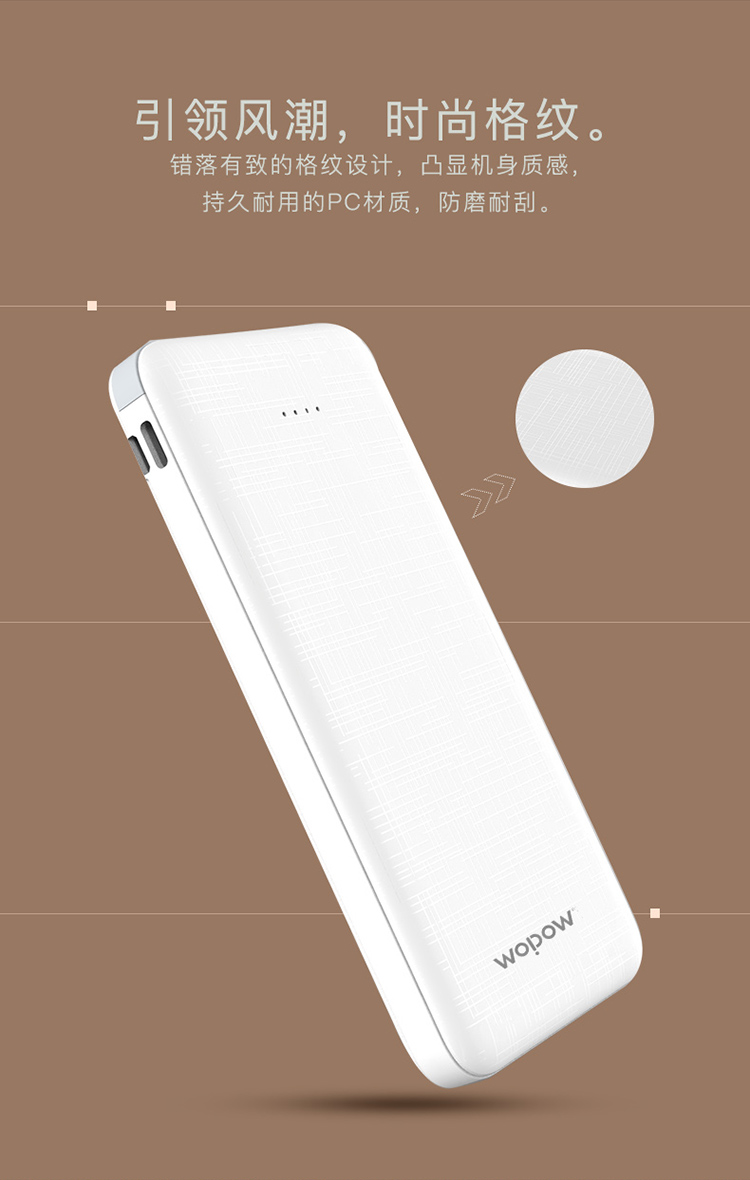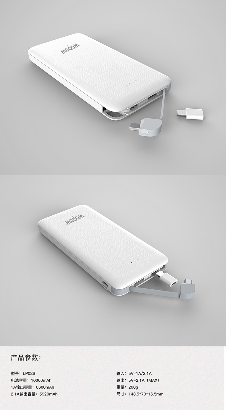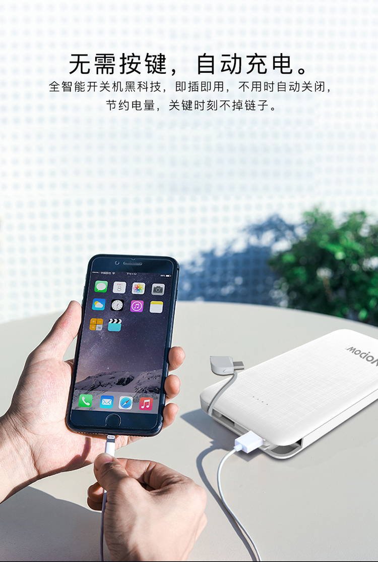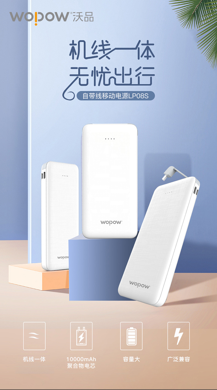 【授权商品】中国wopow/沃品 移动电源自带线机线一体式充电宝 LP08S 白色