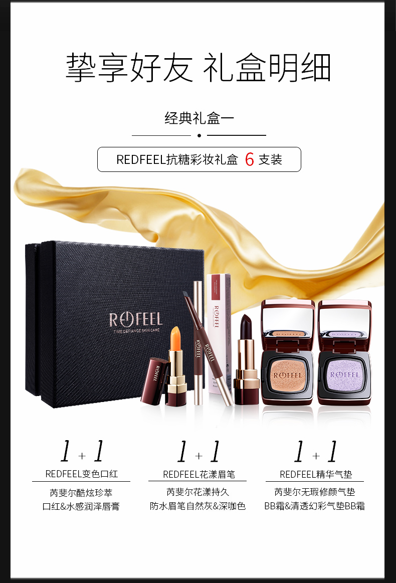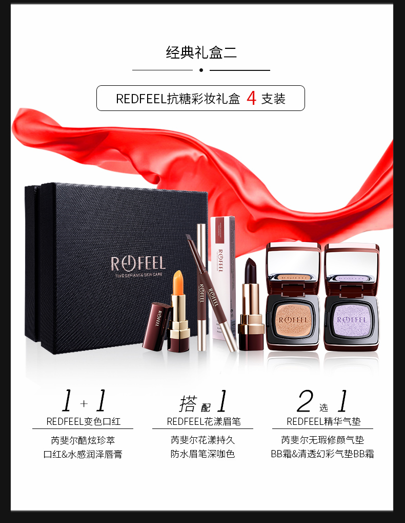 REDFEEL芮斐尔彩妆全套礼盒 口红(2色)+眉笔(2色)+气垫(2色)=6支