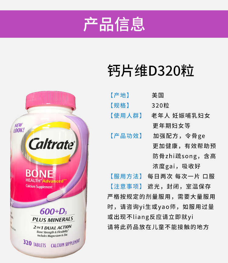 您所在的位置:首页 > 营养保健  > 营养成分 > 钙铁锌  > 【美国直邮】Caltrate钙尔奇钙片600mg+维生素D加强配方易吸收成人补钙 320粒