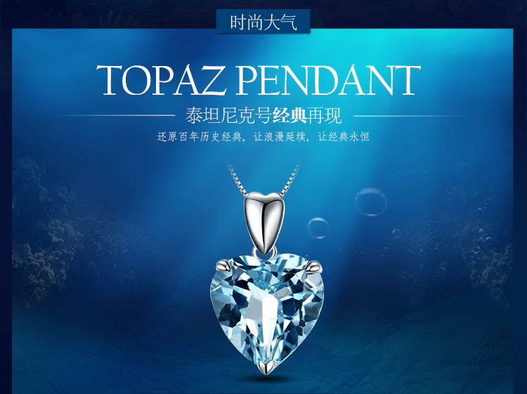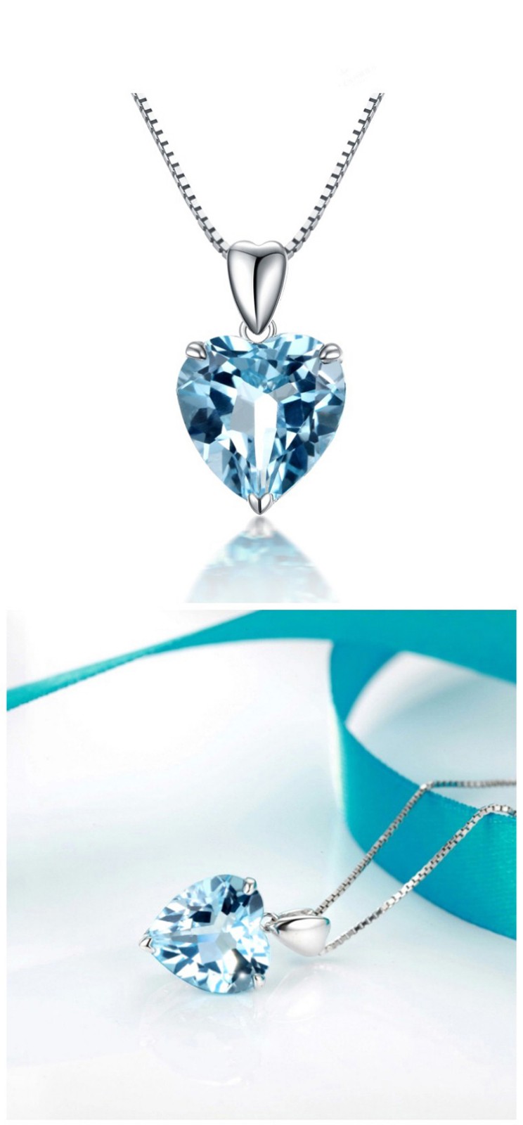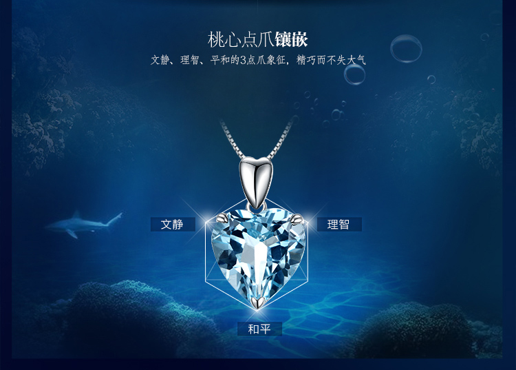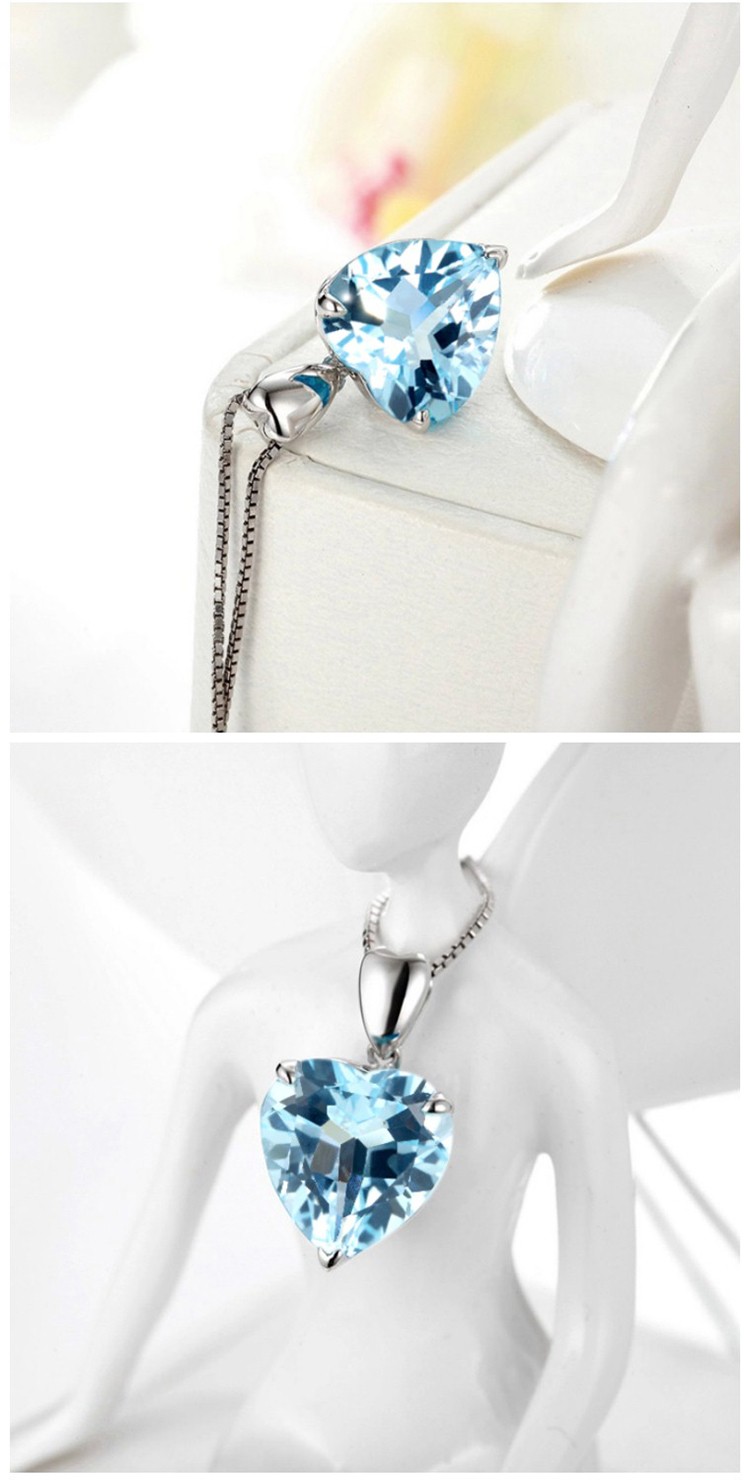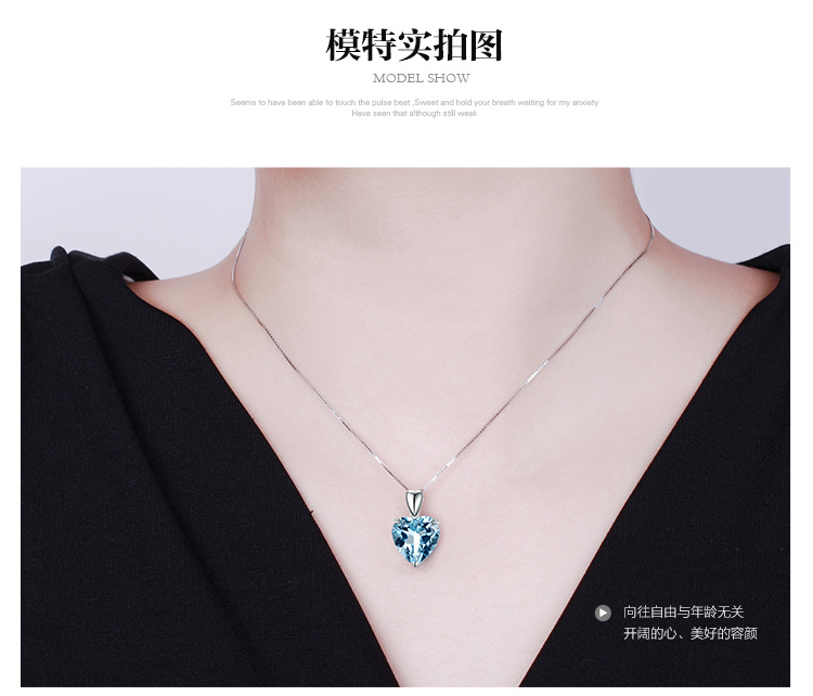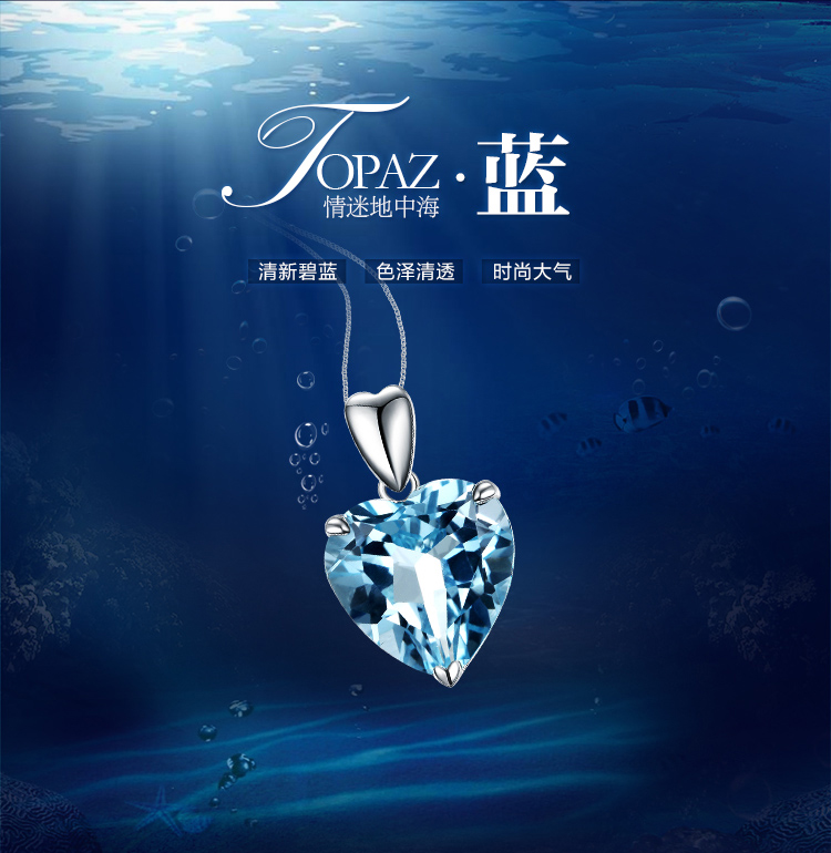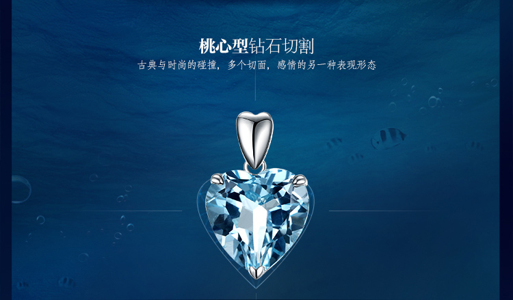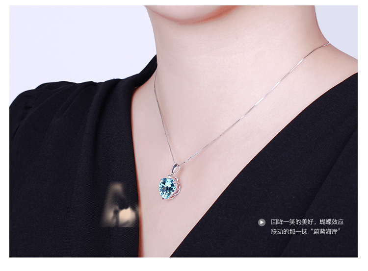 四福珠宝 S925纯银镶心形天空蓝托帕石吊坠