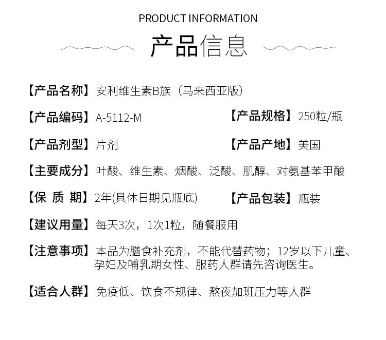 美国安利纽崔莱维生素B族vb250片成人天然维生素b12 亚洲马来版