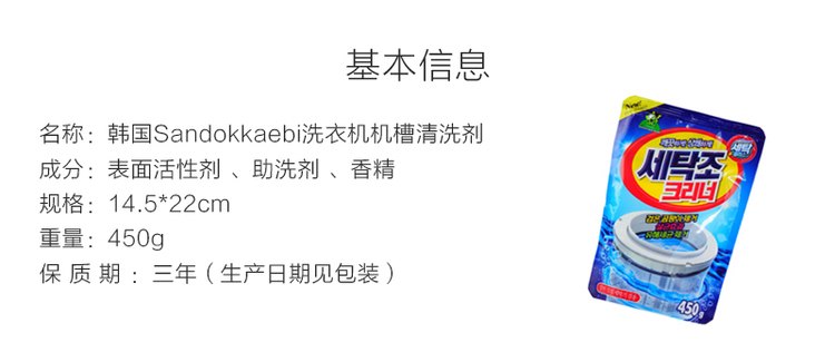 您所在的位置:首页 > 家庭清洁  > 家庭环境清洁 > 家电清洁用品  > 韩国原产Sandokkaebi山小怪植物萃取洗衣机机槽清洁剂 450g*2包