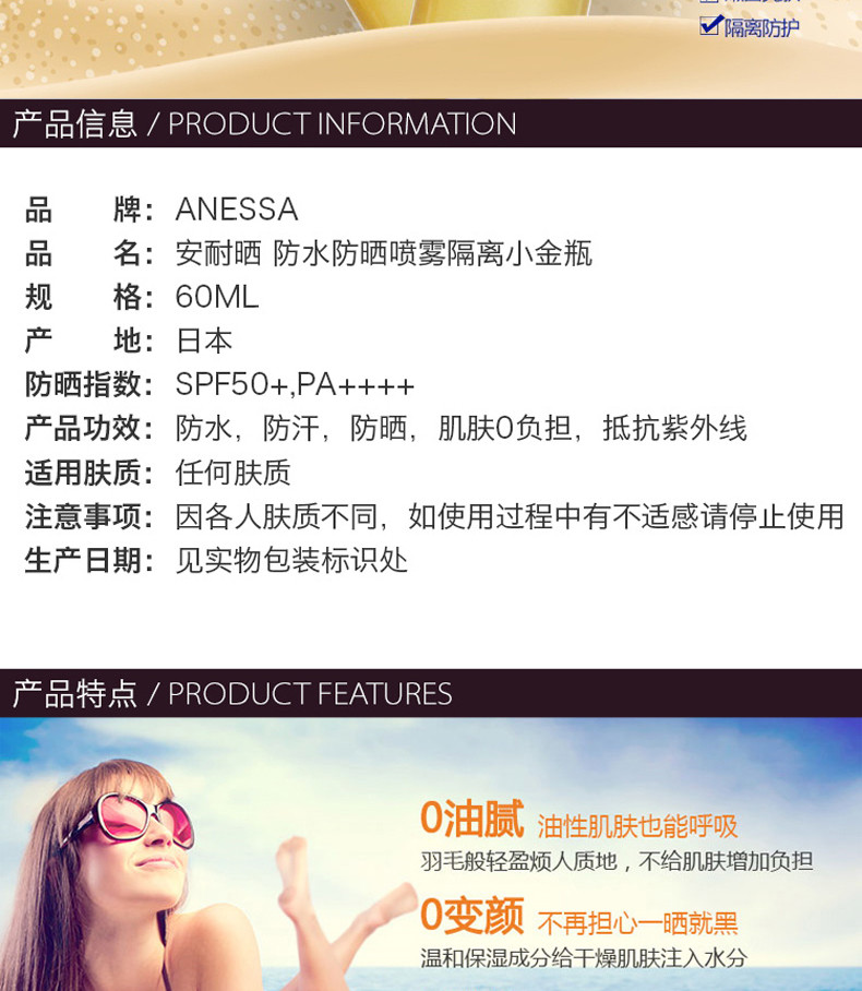 您所在的位置:首页 > 美妆护肤  > 面部护肤 > 防晒  > 【香港直邮】日本 安耐晒金瓶防水防晒喷雾(SPF50+ PA++++) 60g(旧版日期2021.07)