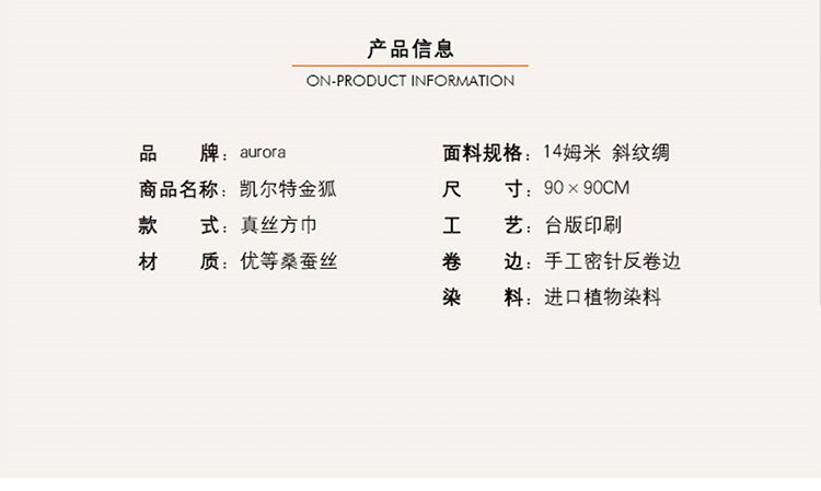 您所在的位置:首页 > 服饰内衣  > 服饰配件 > 女士丝巾/围巾/披肩  > 【七夕礼品】aurora奥罗拉 凯尔特金狐 真丝方巾 桑蚕丝丝绸 90*90cm 经典款 礼物
