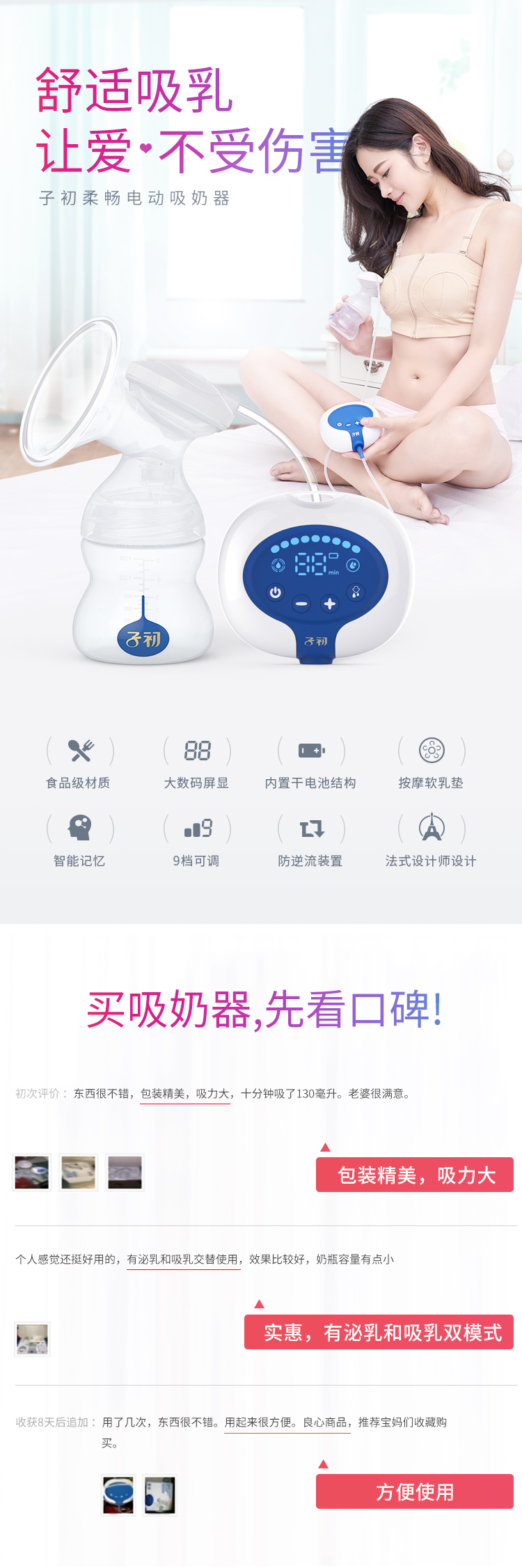 您所在的位置:首页 > 母婴用品  > 喂养用品 > 吸奶器  > 子初 柔畅电动吸奶器(分体式)