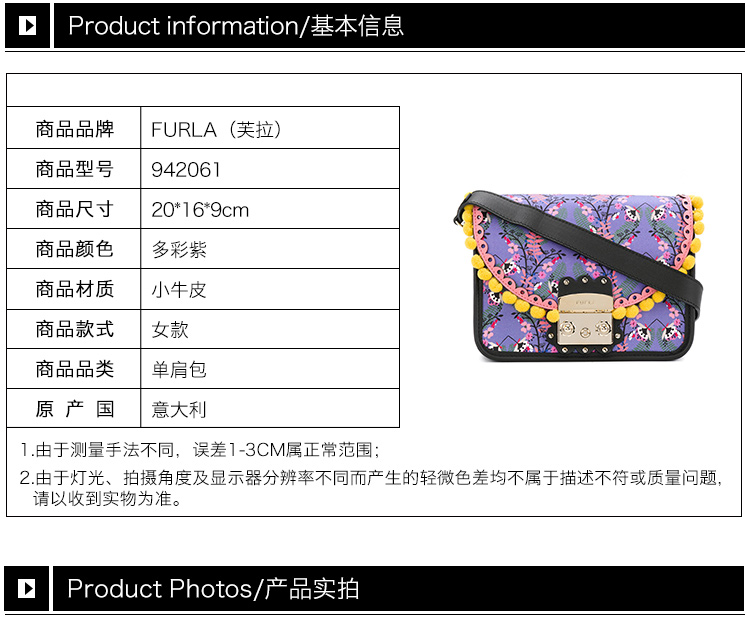 Furla 芙拉 女士多彩紫色小牛皮单肩包斜挎包 942061