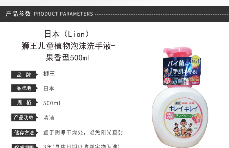 日本(Lion)狮王儿童植物泡沫洗手液-果香型500ml