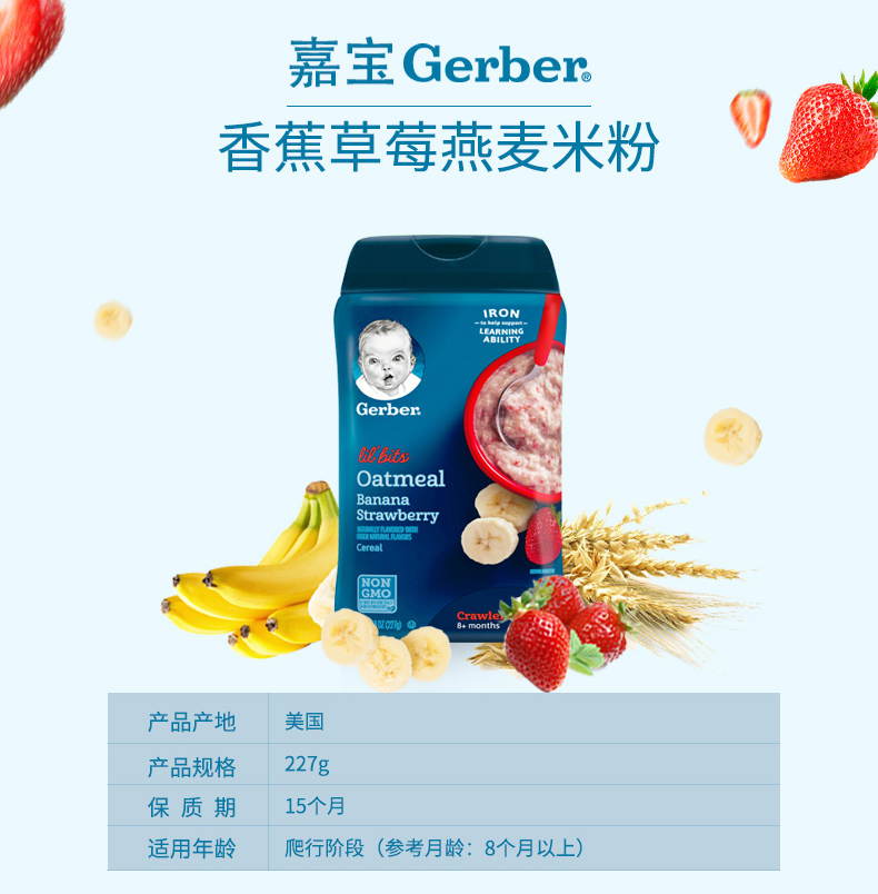 美国Gerber嘉宝三段草莓香蕉燕麦米粉227g