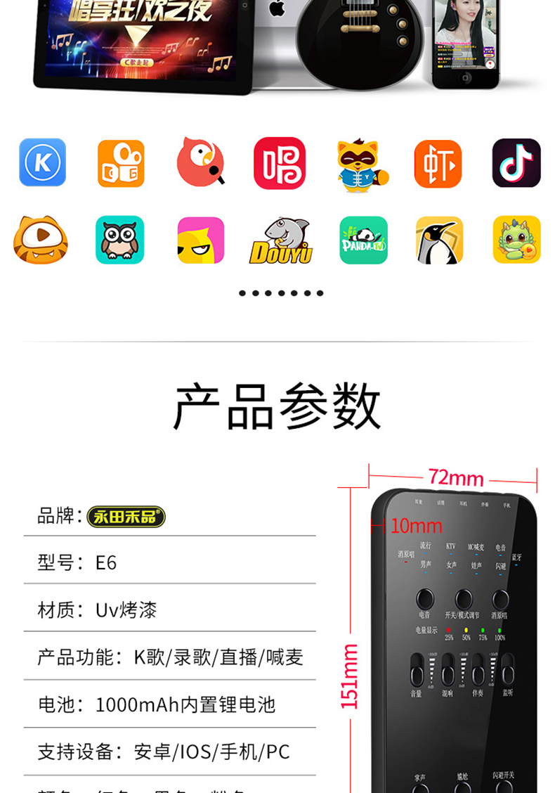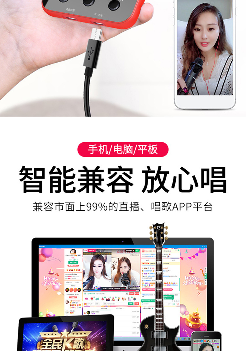 永田禾品 网红直播设备声卡唱歌手机麦克风话筒电脑k歌蓝牙变音 话筒+声卡黑色