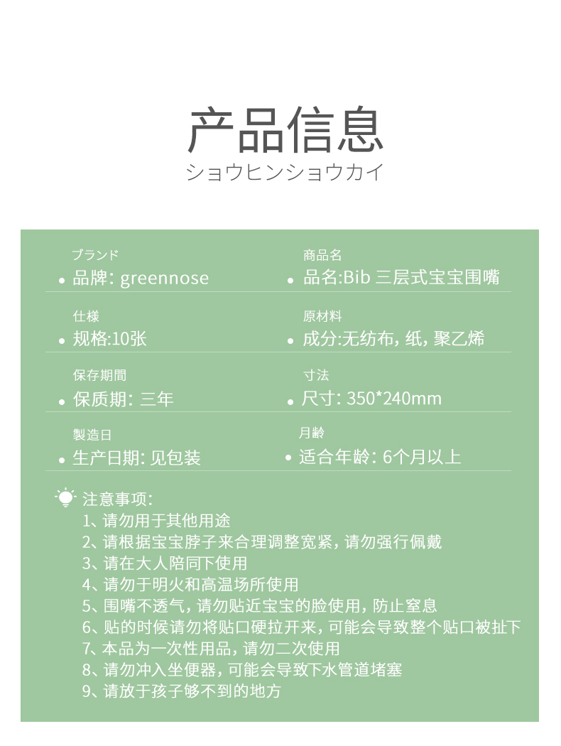 日本绿鼻子围兜一次性防水立体饭兜婴儿童围嘴口水兜免洗便携10片英伦邮票